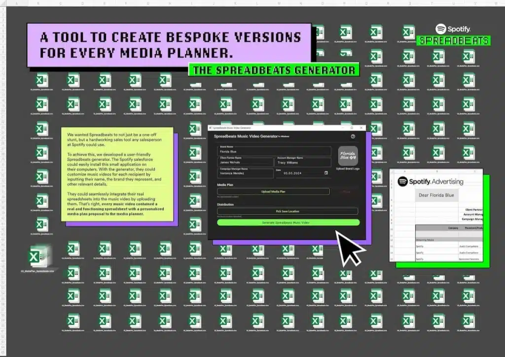 Vì vậy, MV Spreadbeats được ra lò với ý tưởng là một bảng kế hoạch sáng tạo gửi đến các media planner – đối tượng tiềm năng mà Spotify mong muốn thuyết phục họ chọn nền tảng của mình làm kênh quảng cáo. Thông qua chiến dịch, họ sẽ được trải nghiệm một bản kế hoạch sống động, khác xa cảm giác khô khan thường gặp khi phân tích số liệu trên các media plan. Và đồng thời, Spotify muốn truyền tải cách thức mà video kết hợp âm nhạc có thể tạo ra trải nghiệm ấn tượng hơn cho người xem. Từ đó, Spotify hy vọng thay đổi góc nhìn của các media planner về nền tảng này – nơi không chỉ dành cho quảng cáo âm thanh.