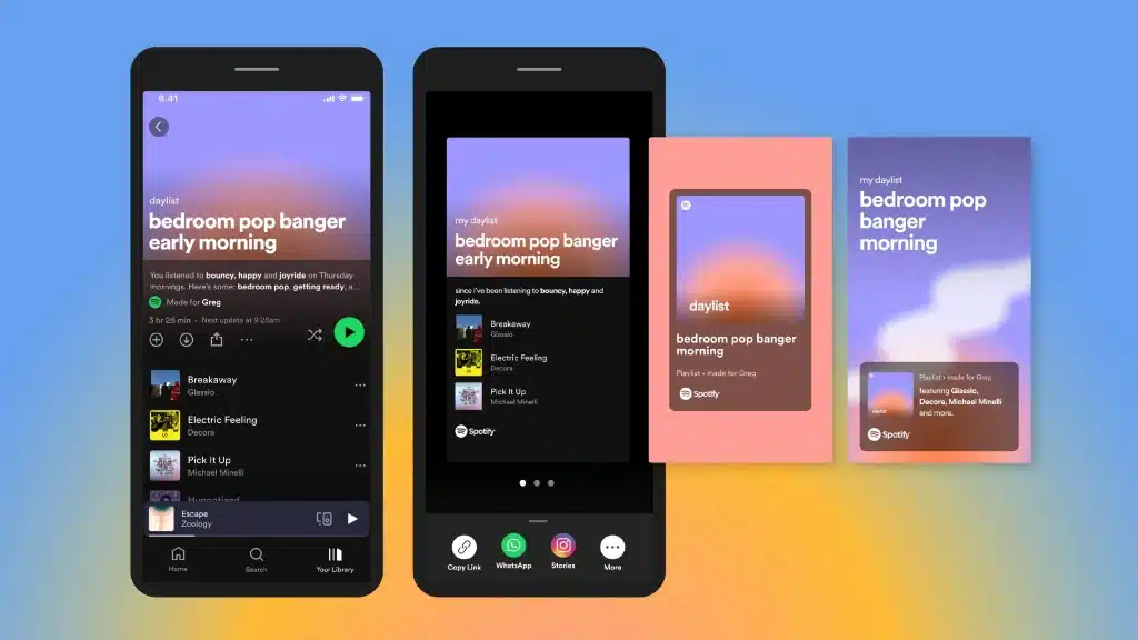 Ngoài danh sách nhạc liên tục được cập nhật, phần visual hiển thị trong Daylist cũng được tinh chỉnh để tương thích với những thời điểm khác nhau trong ngày. Nó có thể chuyển từ màu vàng tươi tắn nổi bật trên nền xanh da trời vào buổi sáng sang những gam màu ấm áp của hoàng hôn lúc chiều tà, sau đó biến thành tông màu sáng trăng êm dịu vào ban đêm và cuối cùng hòa vào một màu đen sâu thẳm của màn đêm khi về khuya.
