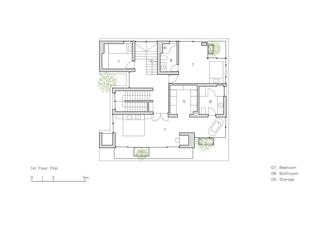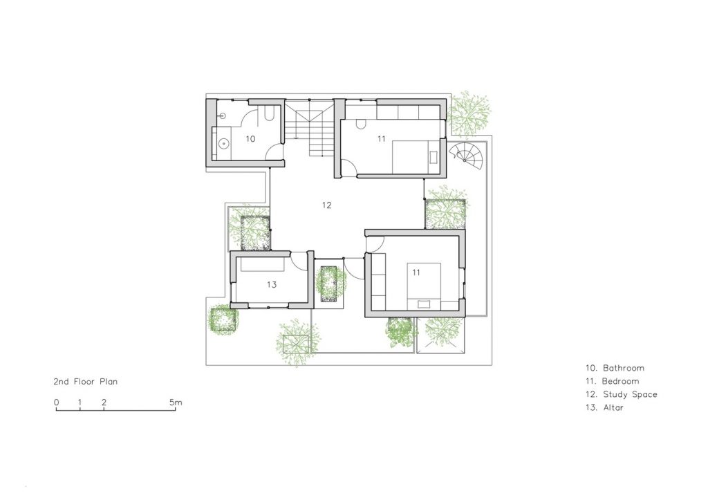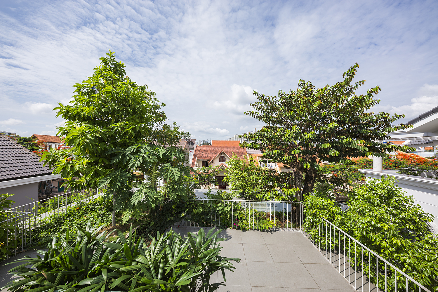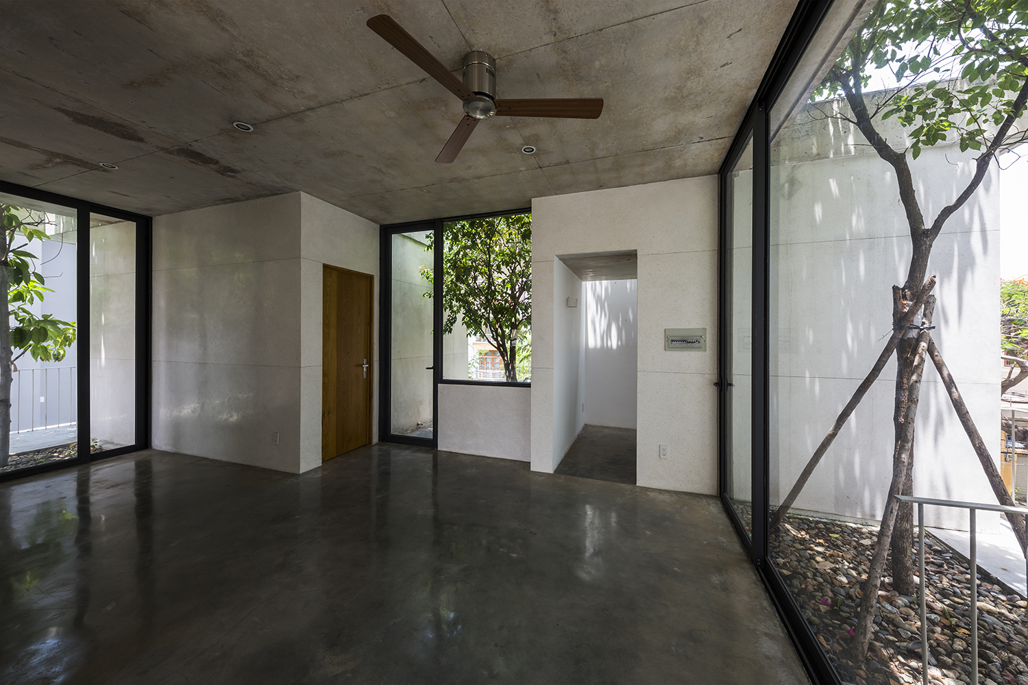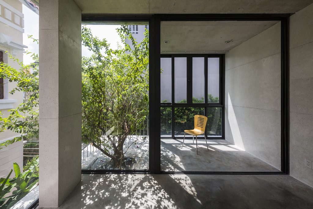 Nằm trong series “Nhà cho cây” của nhóm KTS Võ Trọng Nghĩa, ngôi nhà này được thiết kế cho một gia đình Việt Nam điển hình với ba thế hệ. Mỗi chức năng riêng được đóng gói trong một hộp bê tông dường như được xếp chồng lên nhau một cách ngẫu nhiên. Các tấm bê tông nằm ngang, giữa các hộp là sân thượng nơi cây cối phát triển. Những không gian bán ngoài trời này đóng vai trò là phòng khách và phòng ăn, nơi mọi người tụ tập.