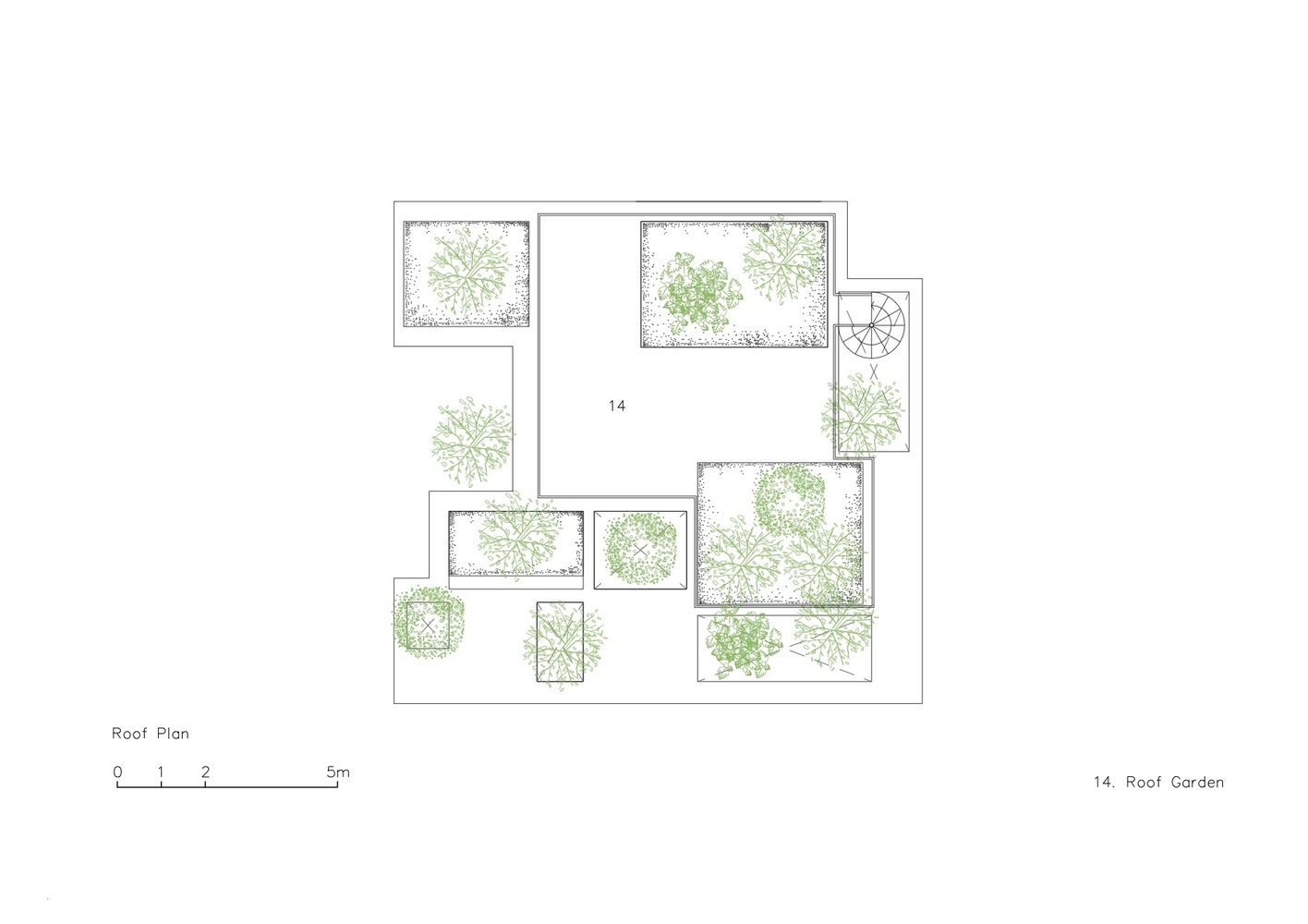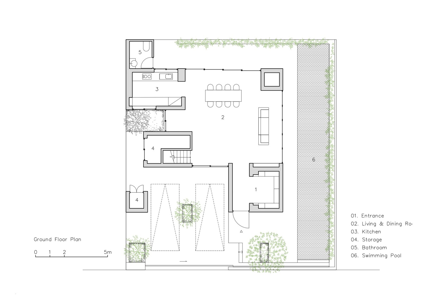 Ngôi nhà nằm trong khu đô thị được quy hoạch gọn gàng, được cư dân xây dựng tối đa chiều cao cho phép. Không gian sống tối đa đã đạt được ở đây bằng cách giảm các khoảng xanh. Bằng cách mang cây xanh trở lại, mỗi ngôi nhà như một công viên nhỏ trong một khu phố rậm rạp.