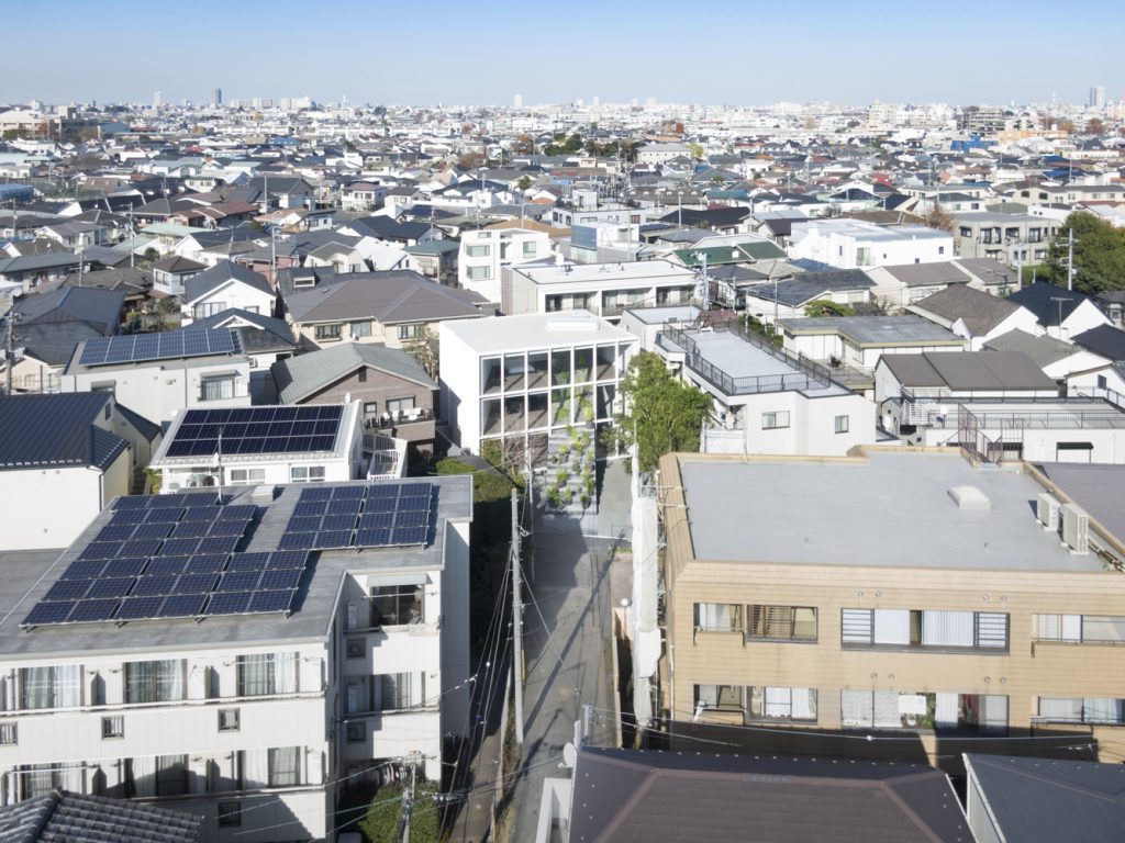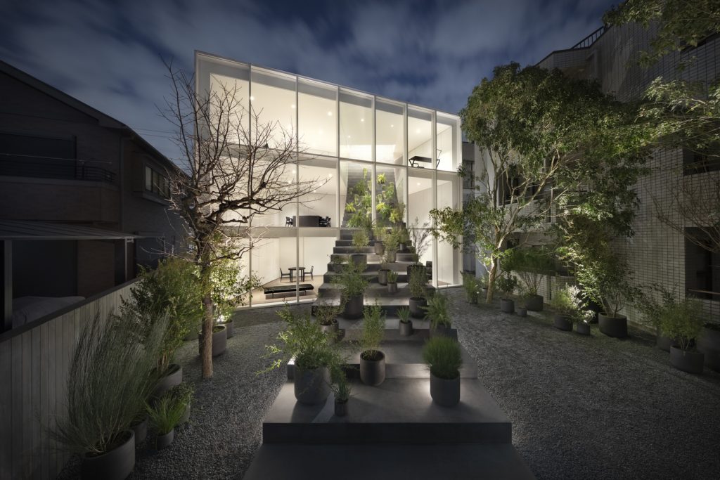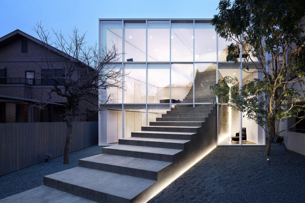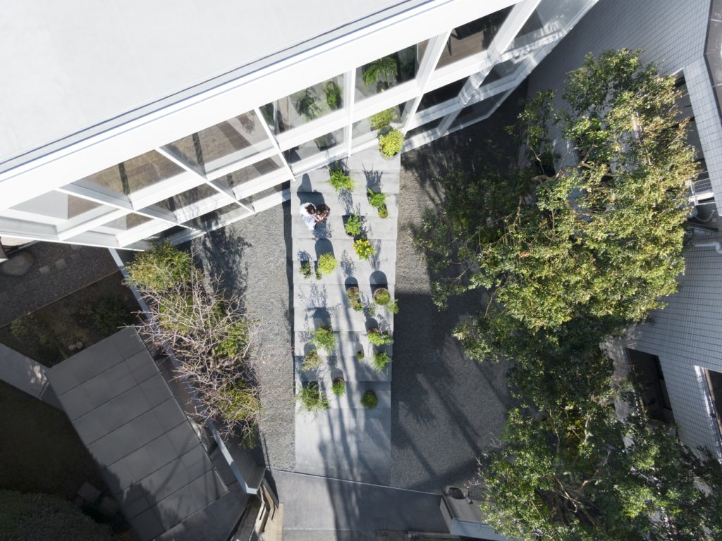 Vị trí của ngôi nhà nằm trong một khu dân cư yên tĩnh ở giữa Tokyo với những ngôi nhà và chung cư khác nằm ép xung quanh khu đất, vì vậy khối lượng kiến trúc được đẩy về phía Bắc để lấy ánh sáng, không khí và cây xanh của sân vào trong nhà thông qua mặt tiền phía Nam bằng kính lớn.
