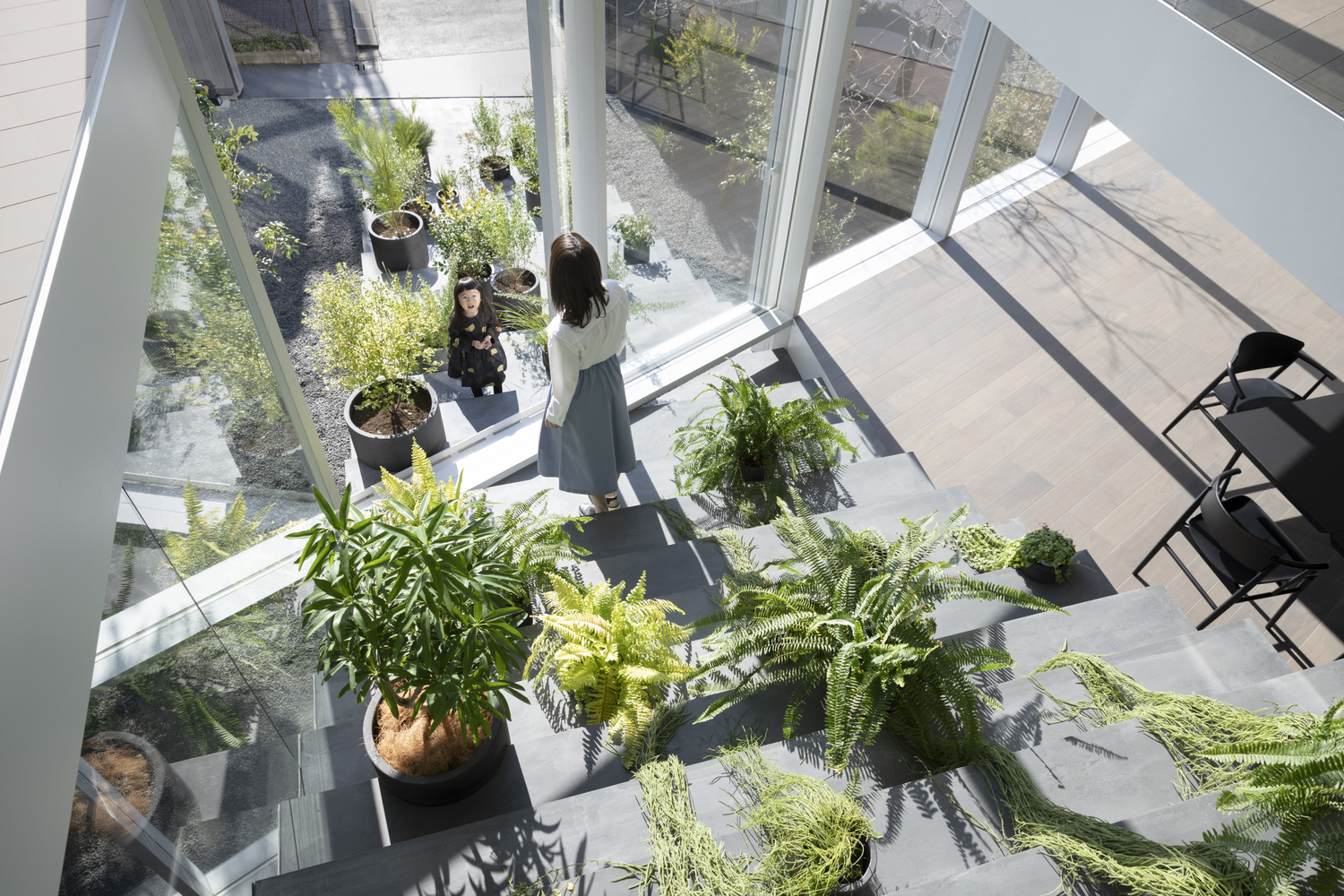 Cặp vợ chồng trẻ và đứa con của họ cư trú trên tầng 2 và tầng 3. Để tránh hai hộ bị ngăn cách hoàn toàn ở phía trên và phía dưới, một cấu trúc giống cầu thang đã được thiết kế ở sân phía nam, tiếp tục đi lên phía trên của tòa nhà và xuyên suốt từ tầng 1 đến tầng 3.