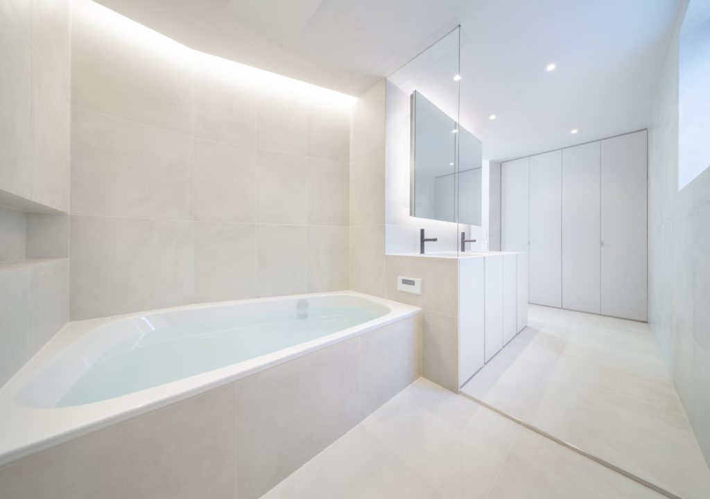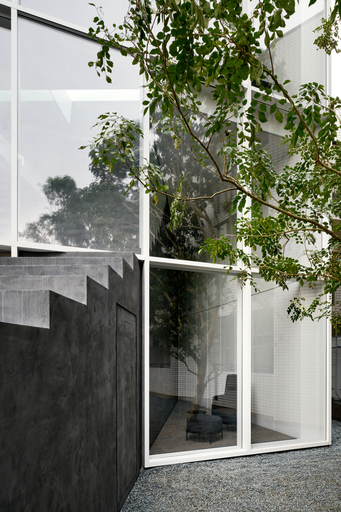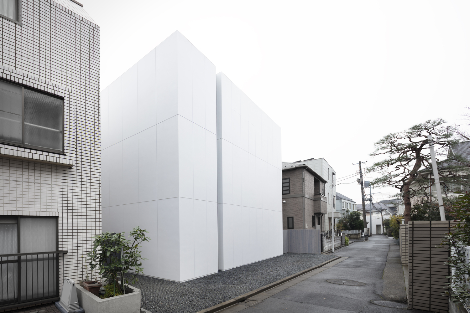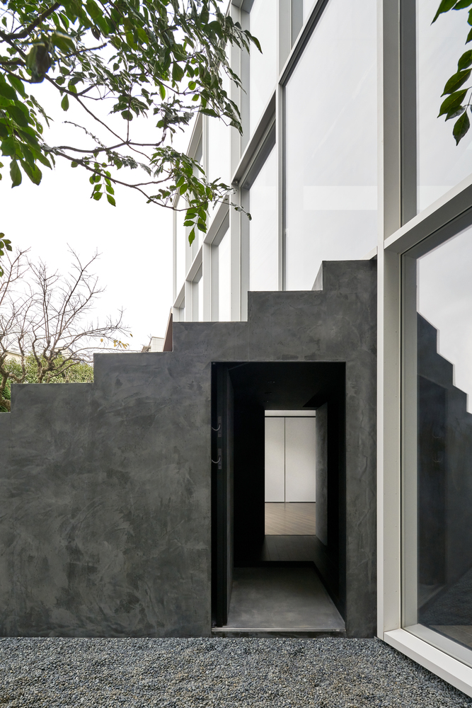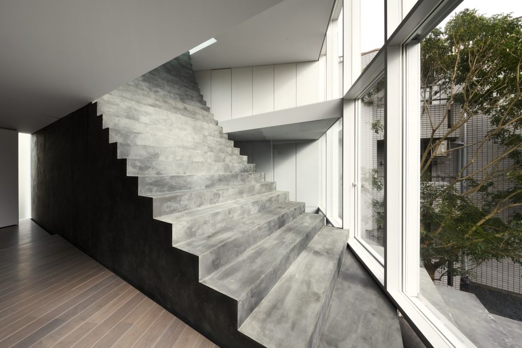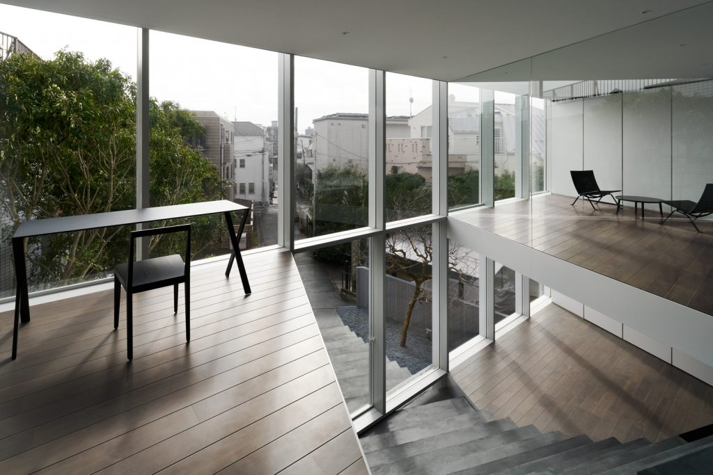 Vị trí của ngôi nhà nằm trong một khu dân cư yên tĩnh ở giữa Tokyo với những ngôi nhà và chung cư khác nằm ép xung quanh khu đất, vì vậy khối lượng kiến trúc được đẩy về phía Bắc để lấy ánh sáng, không khí và cây xanh của sân vào trong nhà thông qua mặt tiền phía Nam bằng kính lớn.