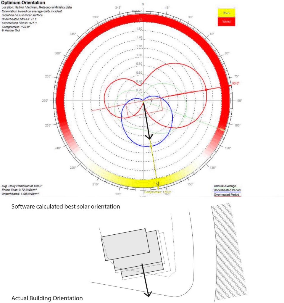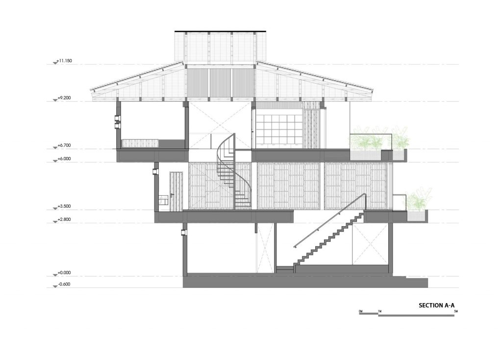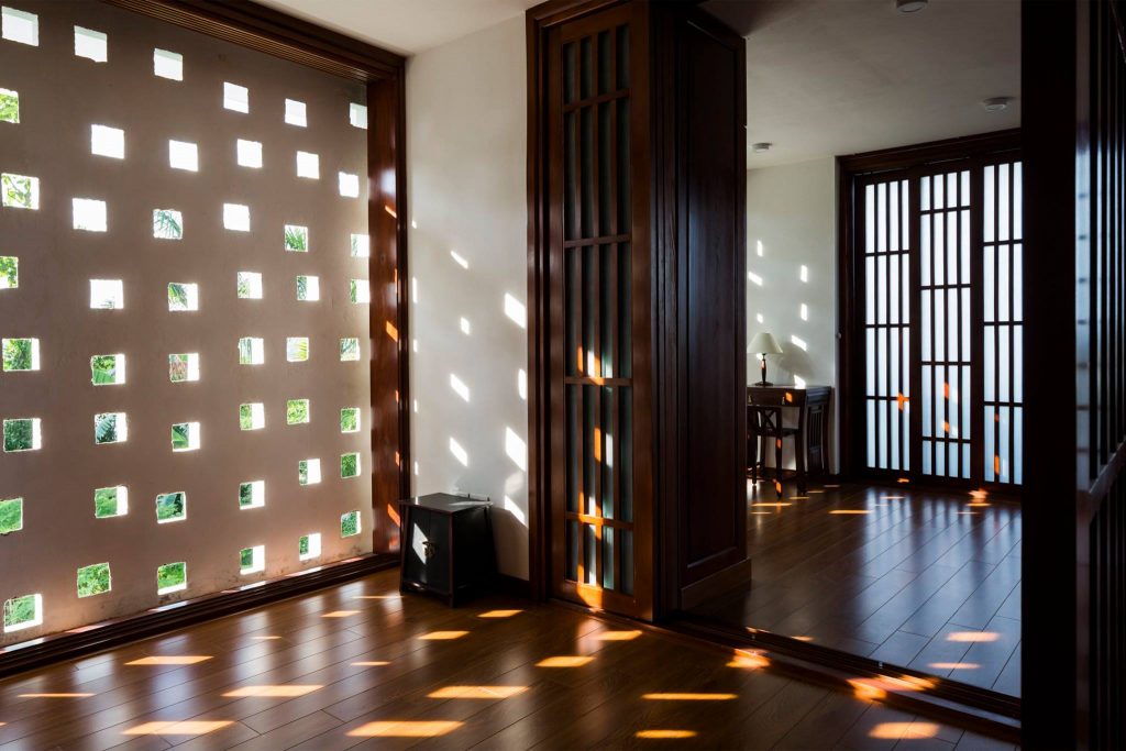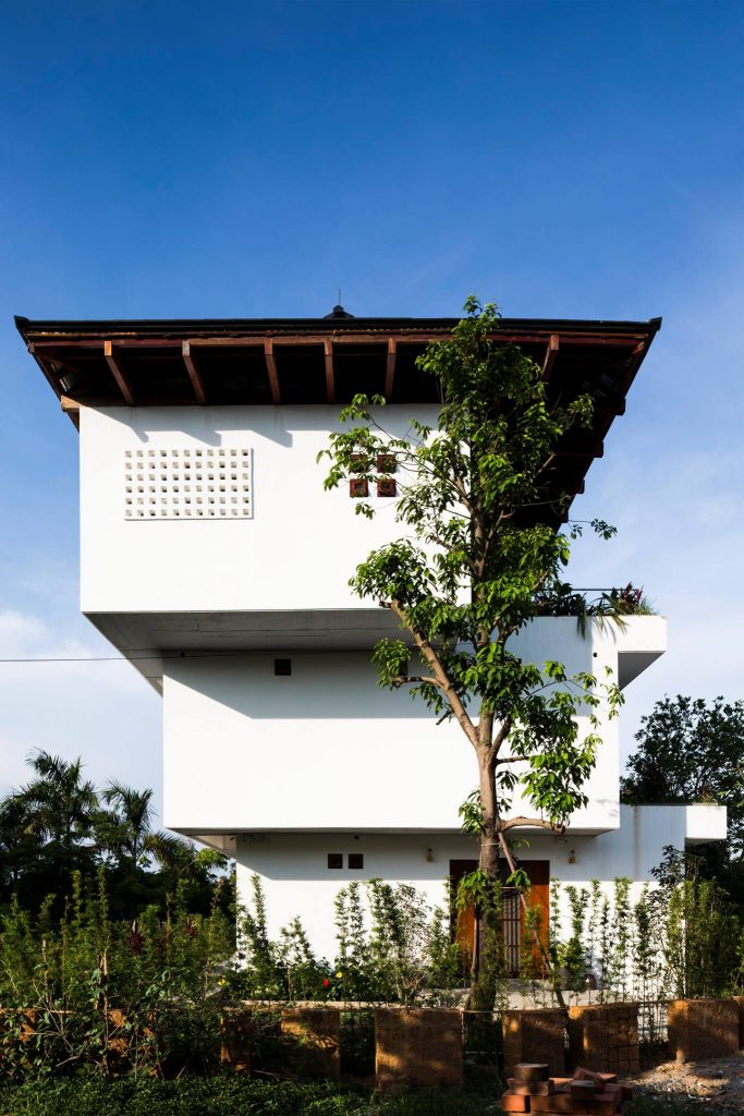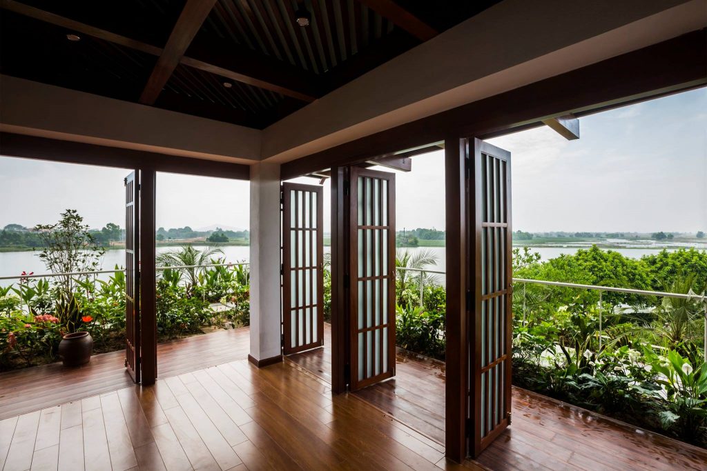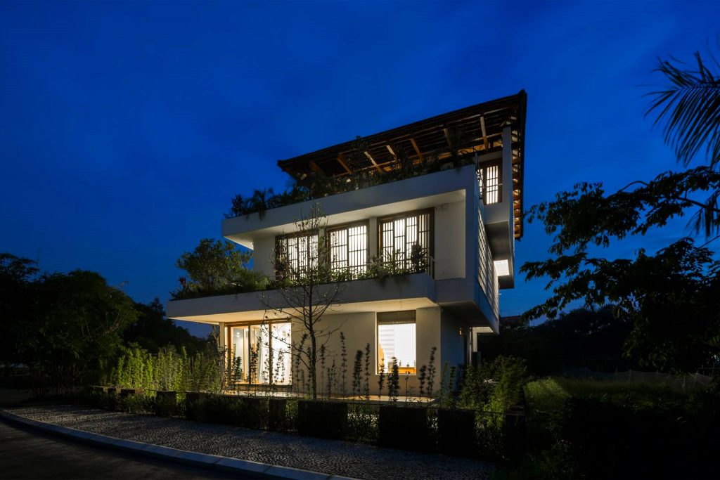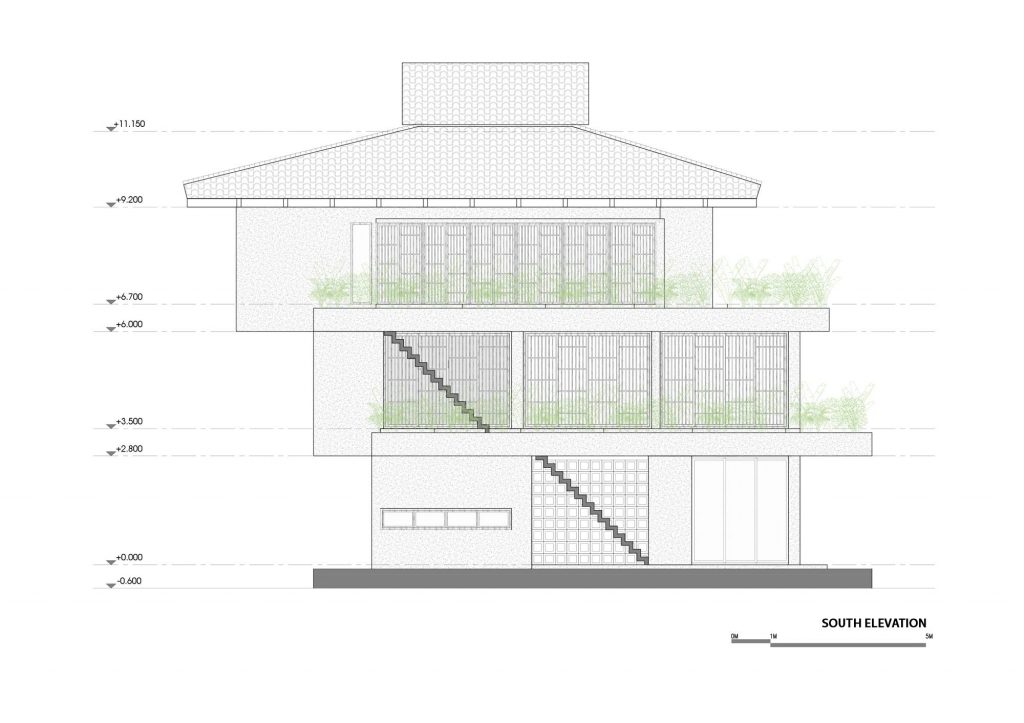 Nằm trên một khu đất gần bờ hồ, nhóm thiết kế đặt cửa và ban công mở toàn bộ từ tầng 1 đến tầng 3 ở phía Nam và phía Đông để tạo ra các khoảng thông và thu được tầm nhìn ra hồ. Còn những khối vật liệu được đặt ở phía Tây Nam để giữ sự riêng tư và thoát khí từ phía Đông Nam.