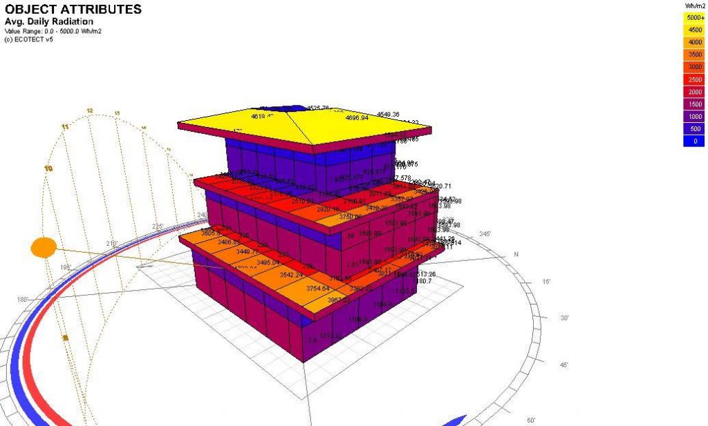 Mỗi tầng đều được thiết kế “xéo”, tạo hình bậc thang cho ban công hướng Đông Nam. Các tầng trên cung cấp bóng râm cho tầng dưới ở phía Tây Bắc và giảm sức hấp thụ nhiệt của kết cấu bê tông cốt thép bên dưới.