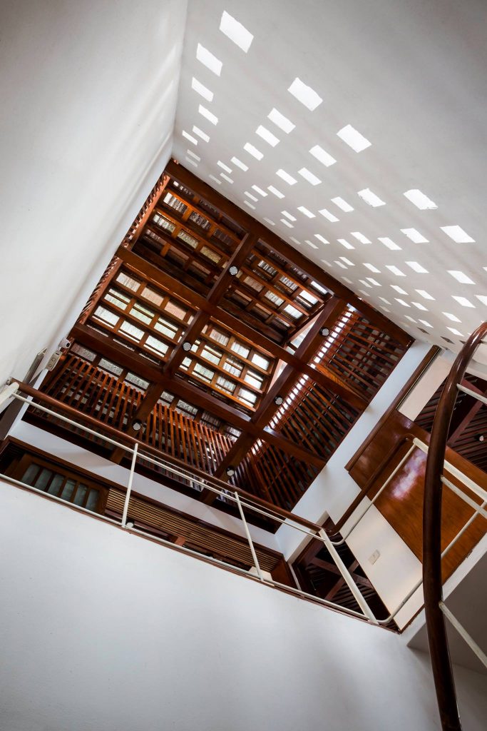 Mái nhà là một cấu trúc bằng gỗ dốc được bao phủ bởi mái ngói gốm với các lỗ thoát khí từ cửa sổ trên đỉnh. Cửa sổ thoát khí này khuyến khích hiệu ứng thông gió ngăn xếp, thoát khí ấm từ tầng 2 và 3 ra khỏi đỉnh mái. KTS đã thảo luận về cấu trúc của mái nhà này với những người thợ mộc địa phương để thiết kế các chi tiết, đồng thời sử dụng phương pháp hiện đại như phân tích môi trường trên máy vi tính.