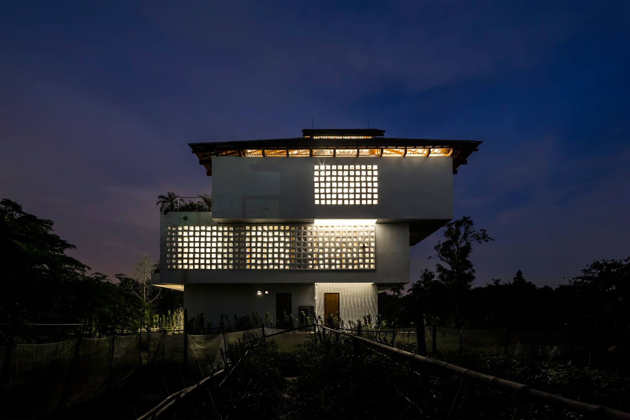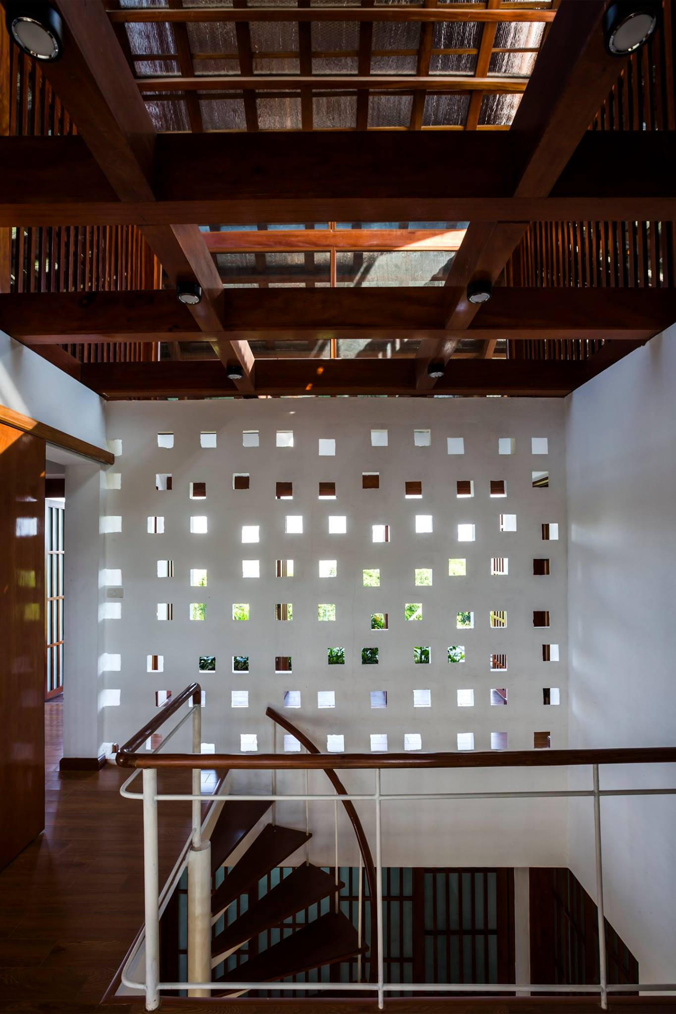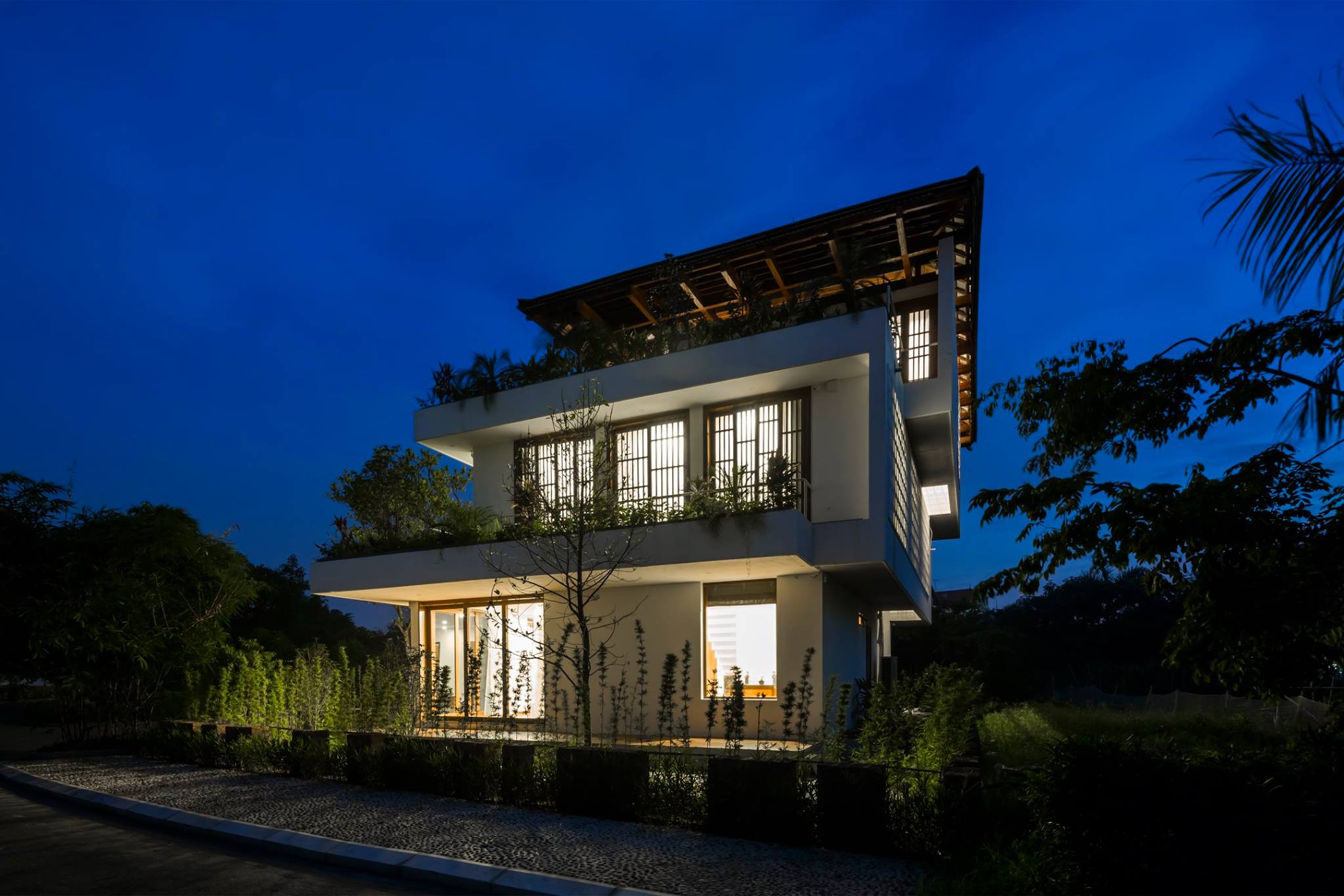 Nằm trên một khu đất gần bờ hồ, nhóm thiết kế đặt cửa và ban công mở toàn bộ từ tầng 1 đến tầng 3 ở phía Nam và phía Đông để tạo ra các khoảng thông và thu được tầm nhìn ra hồ. Còn những khối vật liệu được đặt ở phía Tây Nam để giữ sự riêng tư và thoát khí từ phía Đông Nam.