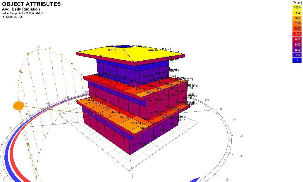 Mỗi tầng đều được thiết kế “xéo”, tạo hình bậc thang cho ban công hướng Đông Nam. Các tầng trên cung cấp bóng râm cho tầng dưới ở phía Tây Bắc và giảm sức hấp thụ nhiệt của kết cấu bê tông cốt thép bên dưới.