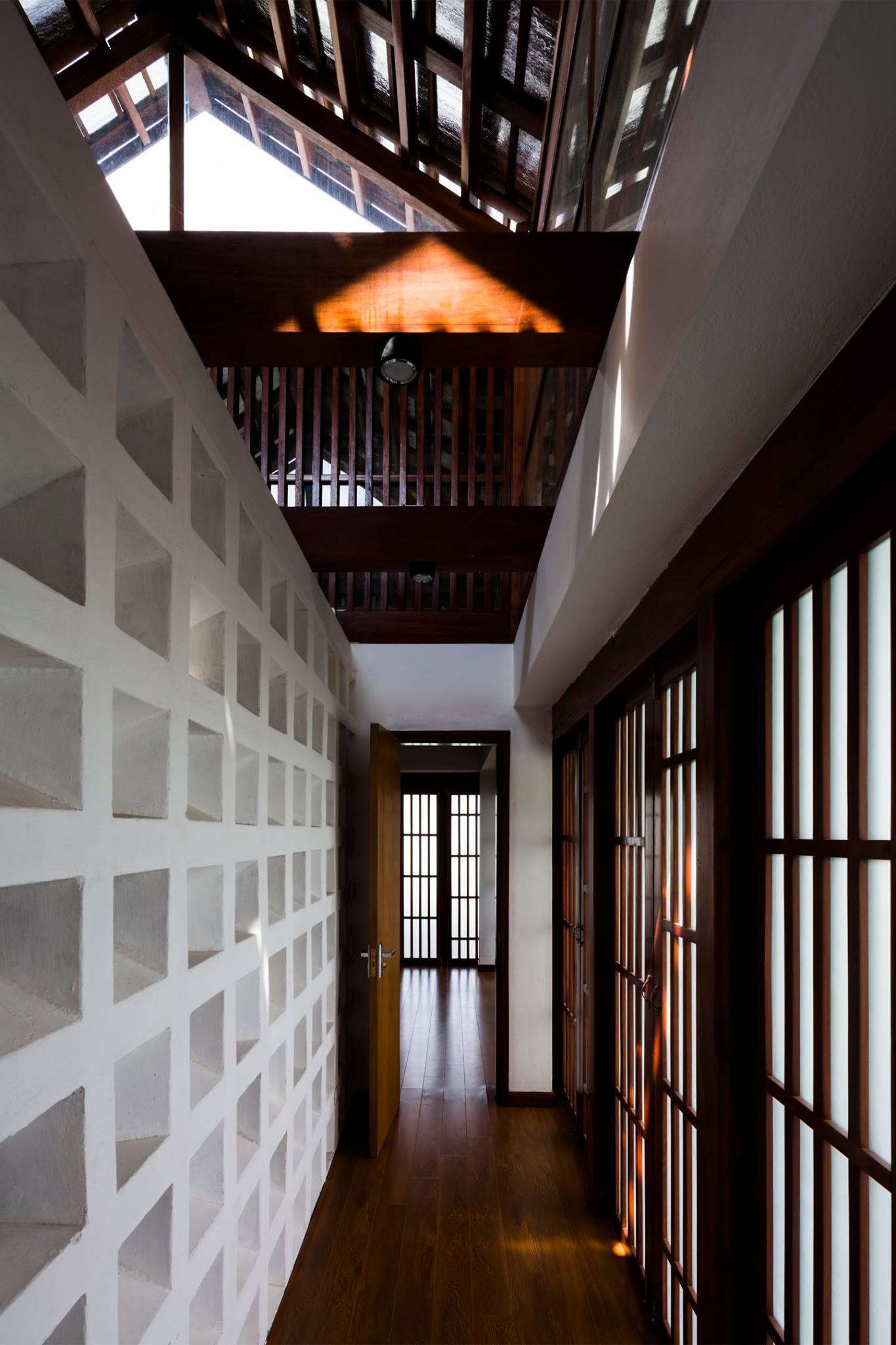 Mái nhà là một cấu trúc bằng gỗ dốc được bao phủ bởi mái ngói gốm với các lỗ thoát khí từ cửa sổ trên đỉnh. Cửa sổ thoát khí này khuyến khích hiệu ứng thông gió ngăn xếp, thoát khí ấm từ tầng 2 và 3 ra khỏi đỉnh mái. KTS đã thảo luận về cấu trúc của mái nhà này với những người thợ mộc địa phương để thiết kế các chi tiết, đồng thời sử dụng phương pháp hiện đại như phân tích môi trường trên máy vi tính.