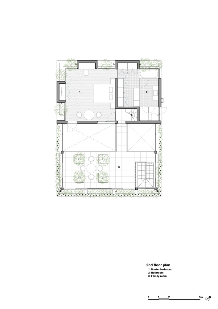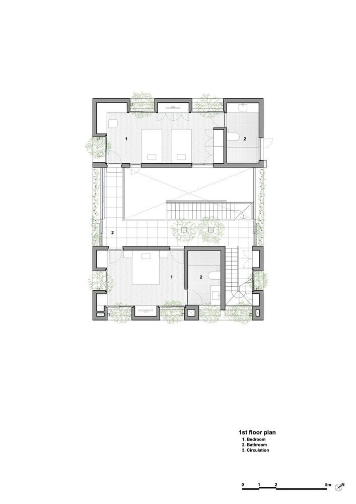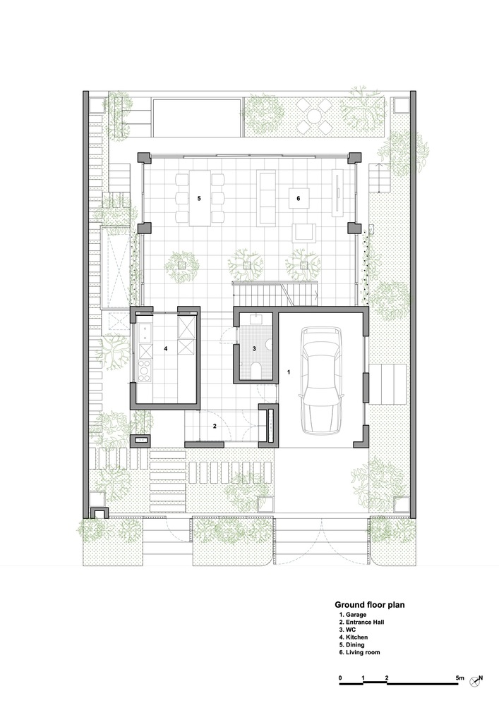 Một khoảng trống lớn được tạo ra bằng cách cắt khối lượng qua ba tầng, theo hướng chéo của mặt cắt. Ở tầng trệt, khoảng trống làm phòng khách, mở ra công viên; trên tầng cao nhất là phòng gia đình phủ đầy cây xanh. Mặt tiền bao quanh nhà được bao phủ bởi cây thường xuân. Khoảng trống kết hợp cả các yếu tố lưu thông và các yếu tố tự nhiên như thực vật và cây cối, cung cấp thêm ánh sáng tự nhiên cho các phòng riêng. Điều này tạo cảm giác liên tục của công viên cho cả ba tầng của tòa nhà. Mục đích là tạo ra một ngôi nhà với môi trường tương tự như một khu rừng, mặc dù ở trong nhà.