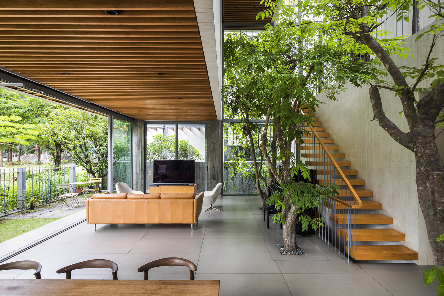 Khoảng trống được mở theo đường chéo lên trên mang lại hệ thống thông gió tự nhiên xuyên suốt ngôi nhà, nhờ hiệu ứng của ống khói. Bằng cách đó việc sử dụng máy điều hòa không khí được giảm thiểu. Bước qua không gian trong ngôi nhà, ta sẽ cảm nhận được luồng gió thổi từ phòng khách lên tầng cao nhất. Mặt tiền xanh làm dịu đi cái nắng gay gắt của khí hậu nhiệt đới. Mô hình trở thành tiền lệ cho nhà ở ở vùng khí hậu nhiệt đới.