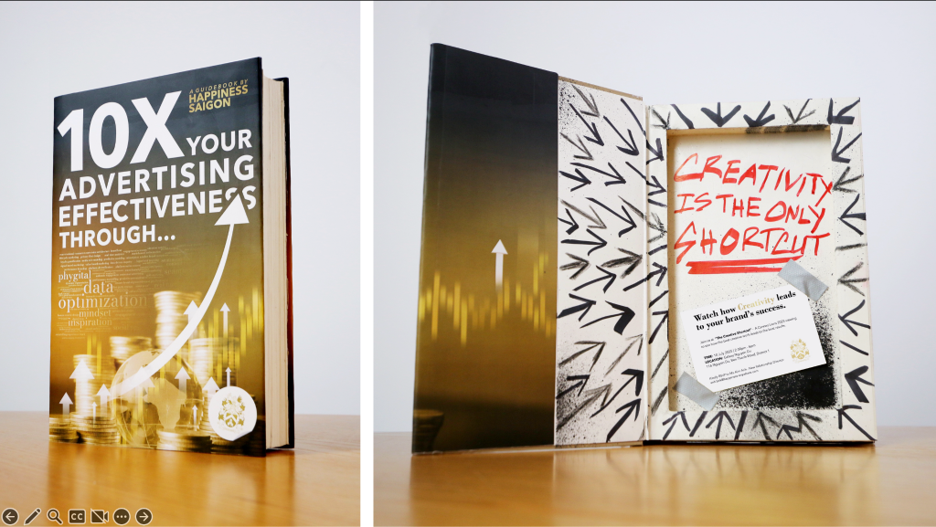 Trước sự kiện, Happiness Saigon đã gửi tới các lãnh đạo doanh nghiệp một hộp quà hình cuốn sách marketing dày gần 400 trang tưởng chừng như tổng hợp mọi công thức quen thuộc. Thế nhưng, ẩn bên trong lại là một tấm postcard mời tham dự, mang thông điệp tinh tế: “Sách vở có thể dạy bạn quy trình nhưng chỉ có ý tưởng sáng tạo mới tạo nên bước ngoặt.”