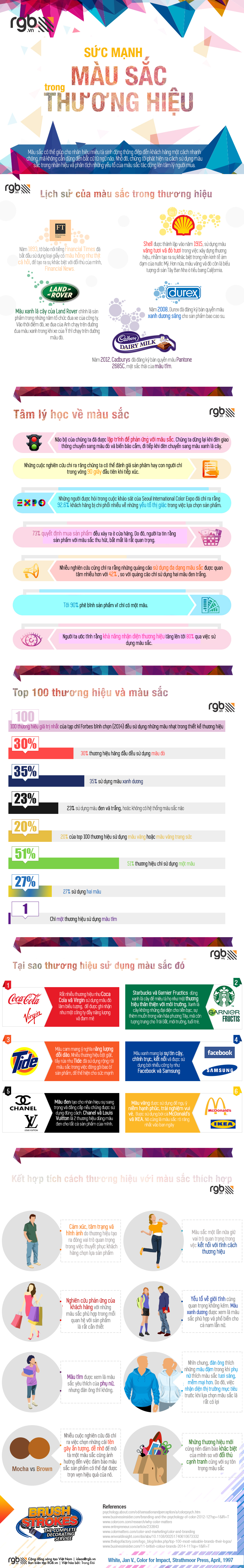 Bài báo cũng đã khám phá ra rằng màu xanh chính là màu sắc phổ biến nhất ở cả nam lẫn nữ. Các thương hiệu sử dụng màu vàng như McDonald’s và Ikea, thì màu vàng tượng trưng cho hạnh phúc và vui vẻ, trong khi nhà thiết kế thương hiệu Chanel và Louis Vuitton, lại chọn màu đen nhằm toát lên vẻ sang trọng và đẳng cấp của thương hiệu. RGB.vn xin chia sẻ với các bạn bản infographic về tầm ảnh hưởng của màu sắc trong thương hiệu đã được Việt hóa dưới đây.
