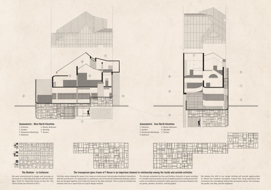Khi thiết kế T House, KIENTRUC O tập trung tạo ra một môi trường để tương tác hơn là tạo hình kiến trúc đơn thuần như cách vẫn thường làm. Thể hiện trong các mối quan hệ tiếp diễn giữa các vùng sử dụng, bên trong ngôi nhà và bên ngoài con hẻm.