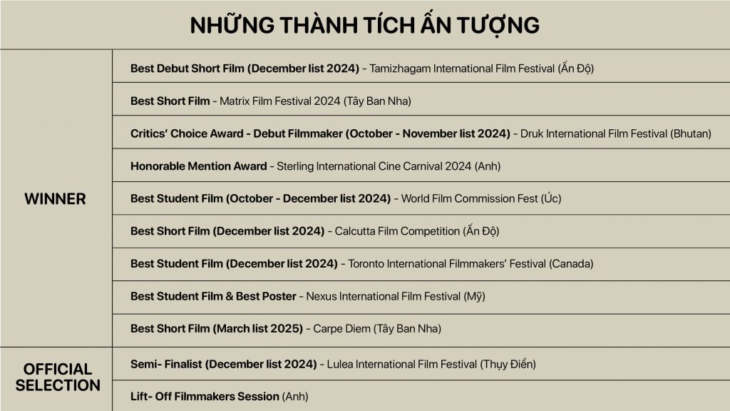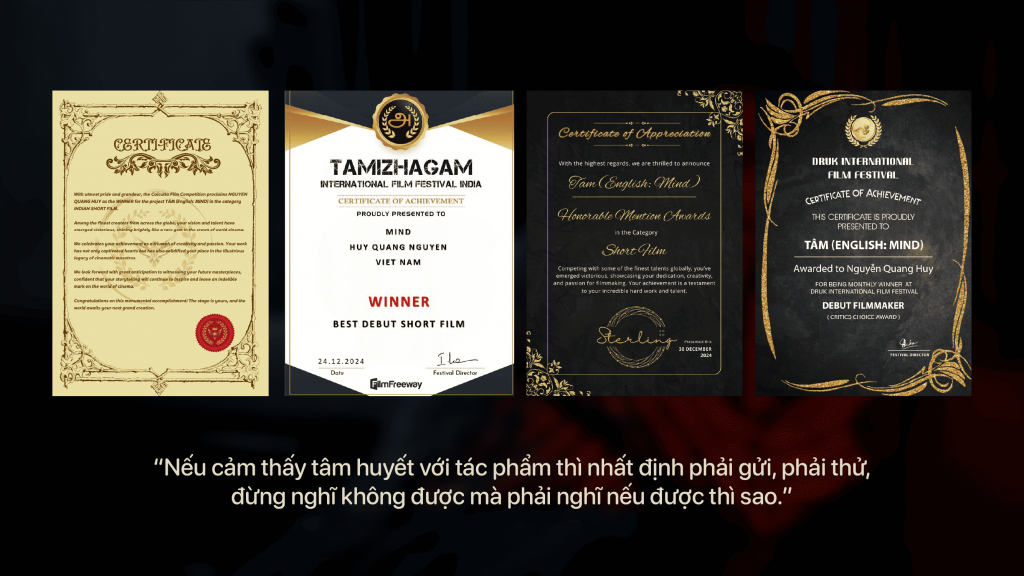 Muốn gửi tác phẩm ra quốc tế thì việc đầu tiên là phải làm phụ đề tiếng Anh và gắn watermark vào nhằm đảm bảo bản quyền bộ phim. Tiếp đến, hãy upload tác phẩm lên các nền tảng cho phép mình gửi đi nhiều chỗ cùng một lúc. Sau khi đã hoàn tất việc gửi đi, trả kinh phí và bấm xác nhận với tất cả các điều kiện thì giờ là lúc ngồi chờ đợi phía ban tổ chức đưa ra kết quả cuối cùng. Vì hầu hết những hạng mục tranh giải mà chúng mình tham gia đều là giải tháng nên quá trình đề cử sẽ diễn ra theo dạng thức từng vòng. Tức là ban giám khảo sẽ xem hết một loạt phim rồi chọn dần dần theo từng giai đoạn. Đối với mỗi liên hoan thì chúng mình lại nhận được một email thông báo rằng bạn đã qua được vòng một, vòng hai… và cuối cùng là email chúc mừng phim của bạn đã được chọn để chiến thắng. Quá trình gửi tác phẩm và được đề cử giải thưởng của “Tâm” đã diễn ra như thế. Hy vọng rằng những chia sẻ trên đây có thể là kinh nghiệm cho mọi người luôn.