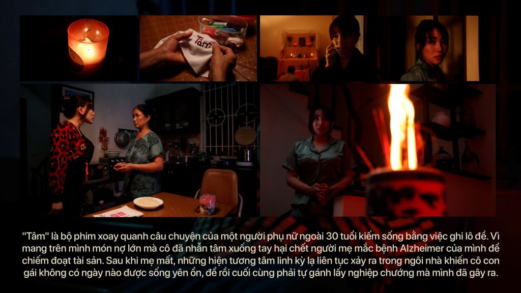 Nói về “Tâm” thì đây là bộ phim xoay quanh câu chuyện của một người phụ nữ ngoài 30 tuổi kiếm sống bằng việc ghi lô đề. Vì mang trên mình món nợ lớn mà cô đã nhẫn tâm xuống tay hại chết người mẹ mắc bệnh Alzheimer của mình để chiếm đoạt tài sản. Sau khi mẹ mất, những hiện tượng tâm linh kỳ lạ liên tục xảy ra trong ngôi nhà khiến cô con gái không có ngày nào được sống yên ổn, để rồi cuối cùng phải tự gánh lấy nghiệp chướng mà mình đã gây ra. Bộ phim khai thác tuyến tình cảm gia đình, mà cụ thể ở đây là tình mẹ con, từ đó gửi gắm thông điệp về chữ hiếu và cái giá phải trả khi phạm tội bất hiếu với đấng sinh thành.