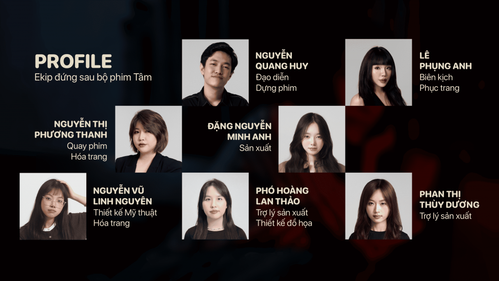 Thực ra, nguồn cảm hứng tạo nên kịch bản cho bộ phim này rất thực tế. Khi xem xét tất cả mọi khía cạnh, từ thời lượng, nguồn tài nguyên tới kinh phí thì chúng mình nghĩ vẫn nên làm một bộ phim trong khả năng của cả nhóm. Bộ phim đó phải vừa gần gũi với khán giả nhưng cũng cần cho họ được trải qua những cung bậc cảm xúc đa dạng, cho nên “Tâm” có chủ đề về gia đình và được kể bằng thể loại kinh dị là vì thế.