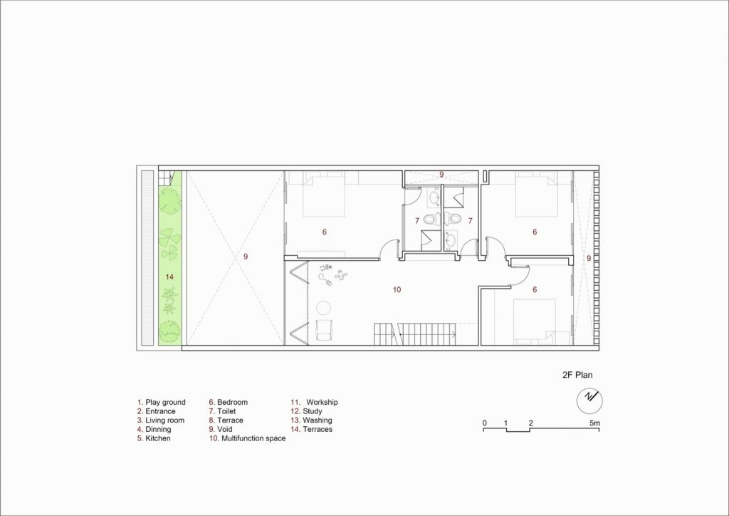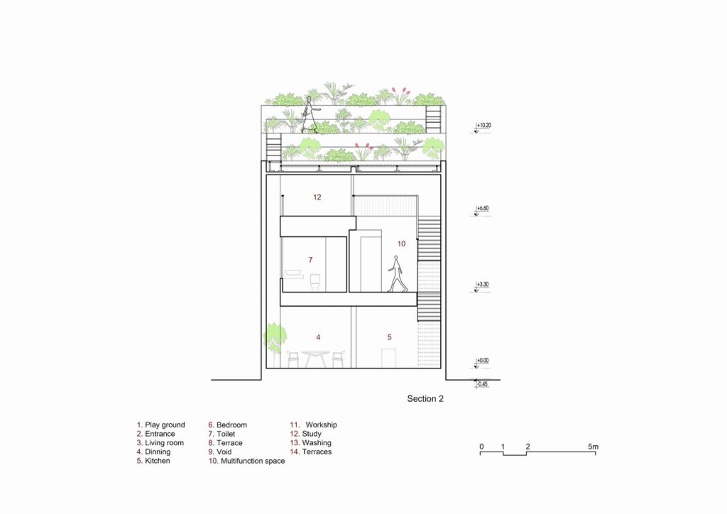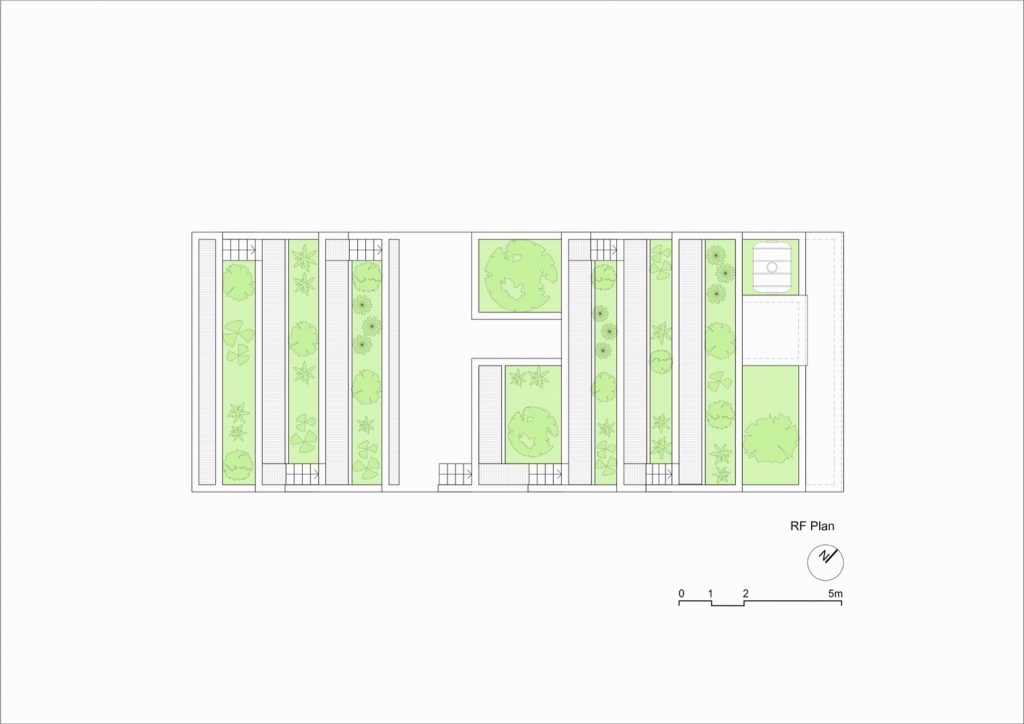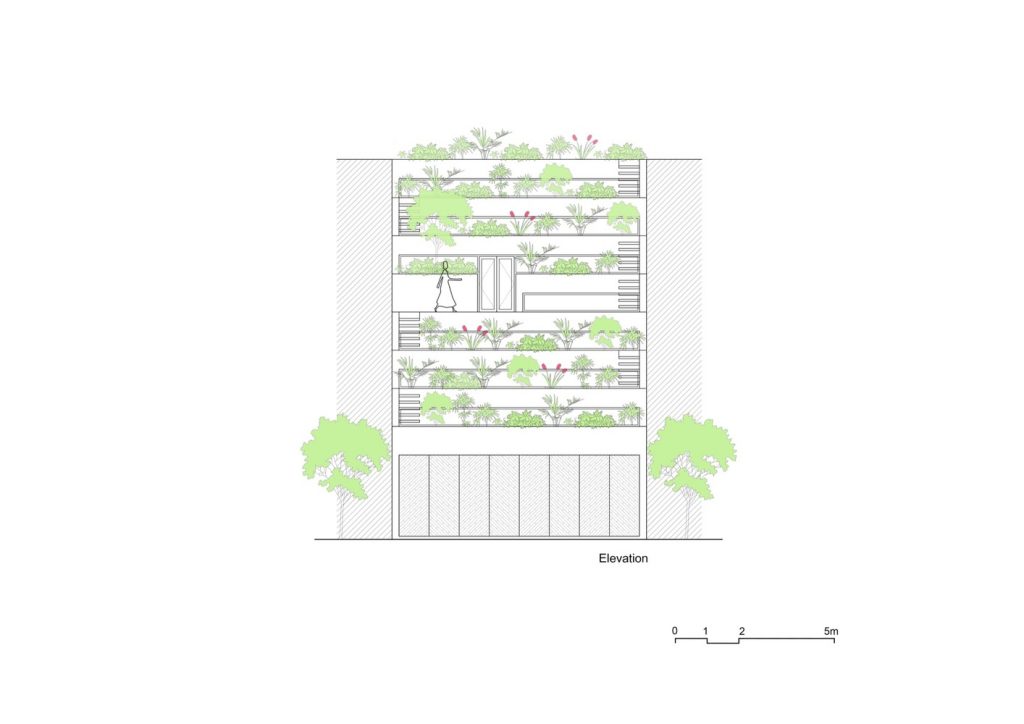 Một số không gian lưu trú được bố trí dọc theo độ dốc của mái nhà để có thể mở rộng ra các góc nhìn, ánh sáng và bóng tối, được kích hoạt bởi các khay bê tông đựng nông sản ở các tầng khác nhau ở trên cao. Dọc hai bên mái là hệ thống tưới tiêu để giữ cho các mảnh đất nông nghiệp luôn xanh tươi, giảm thiểu các tác động xấu của môi trường sống và điều kiện thời tiết nhiệt đới gió mùa như thiếu cây xanh, tiếng ồn, khói bụi, nắng nóng, bão lụt, v.v.