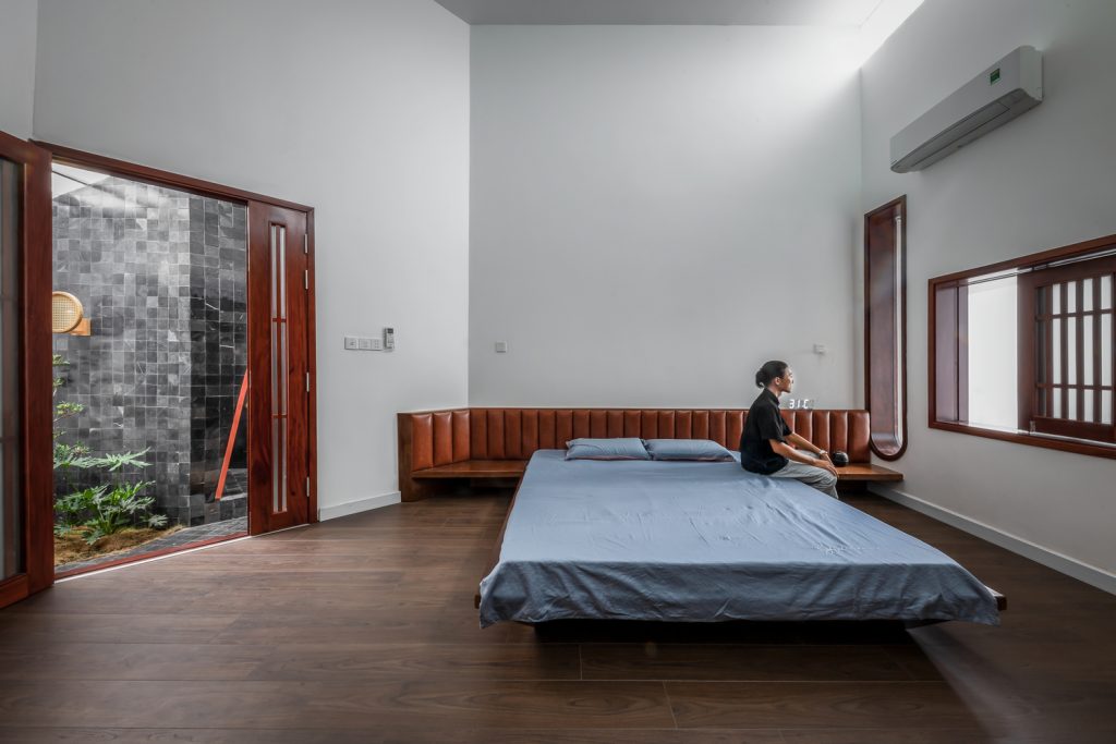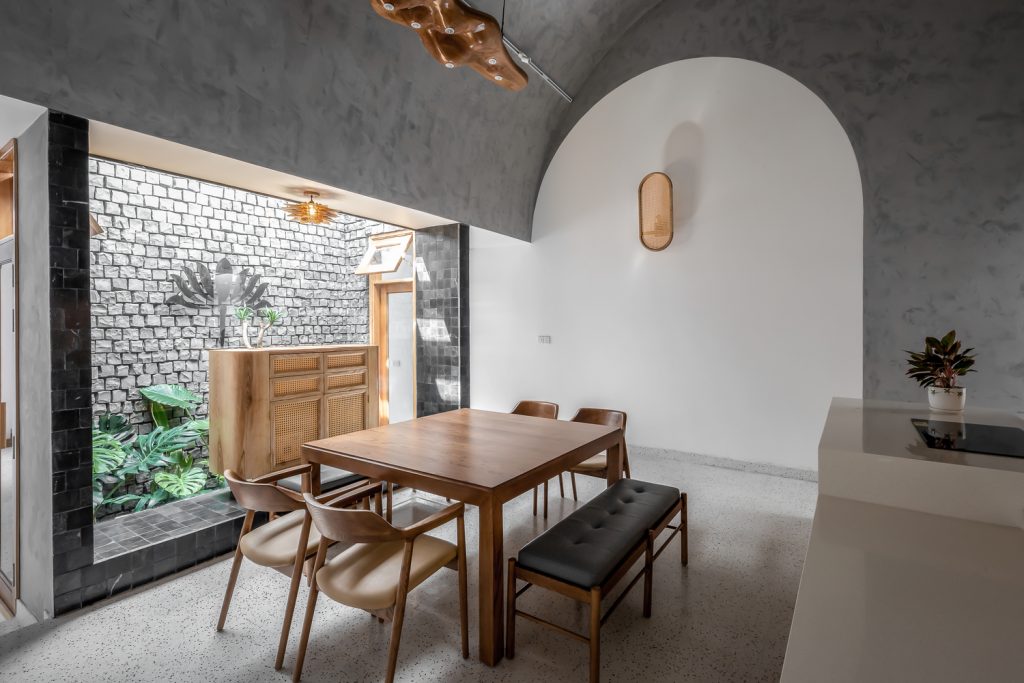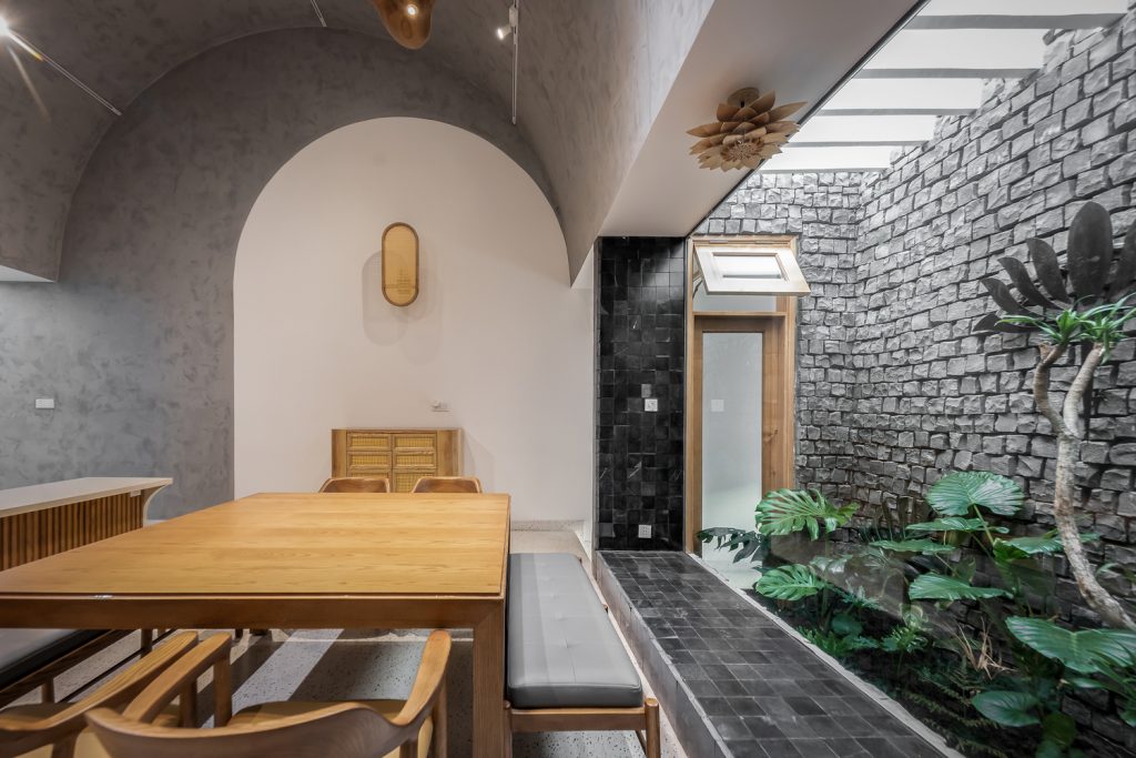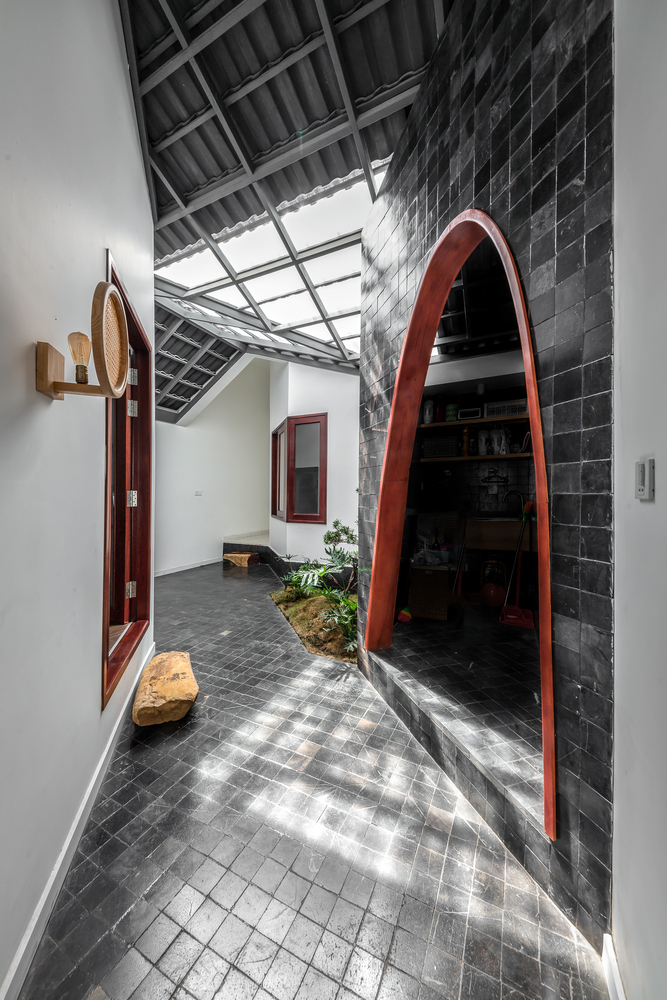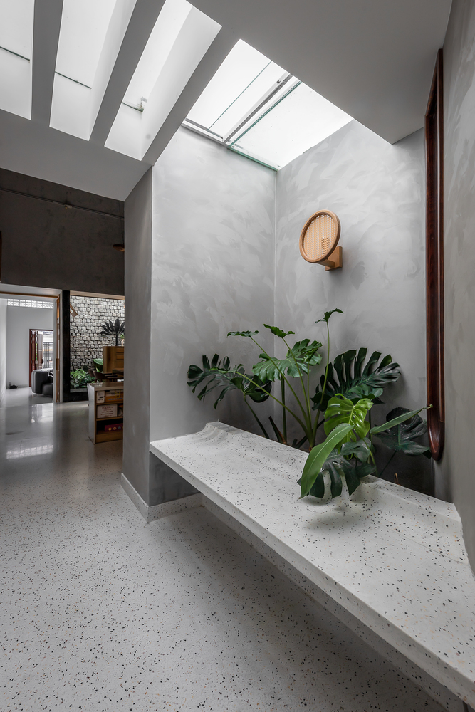 Bên trong nhà có ba giếng trời giúp cải thiện lưu thông không khí trong nhà, tăng lượng ánh sáng và gió tự nhiên. Đây là những yếu tố cần thiết để làm hài hòa cảm xúc của những người sống ở đây. Ngôi nhà được chia thành nhiều khối với chiều cao khác nhau để tránh sự lặp lại trong một không gian quá dài.