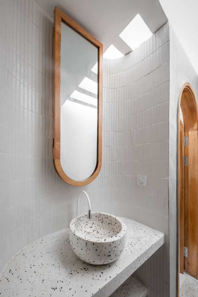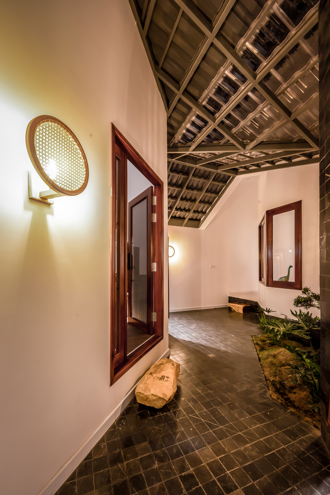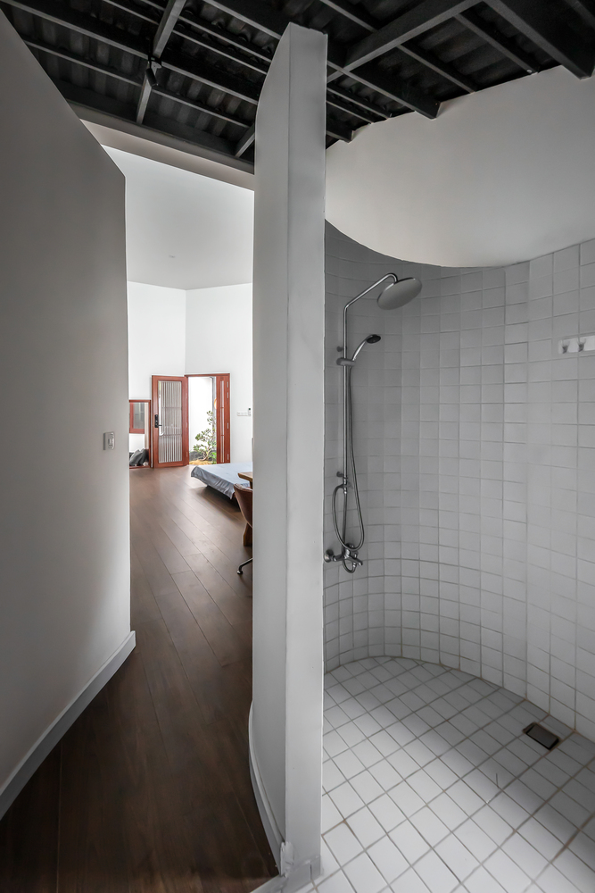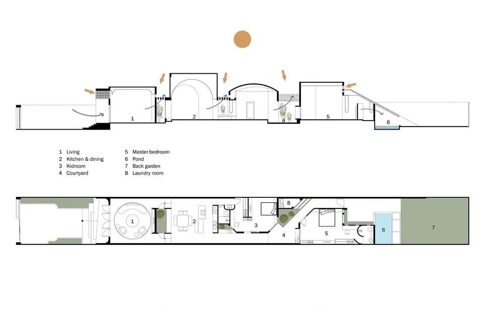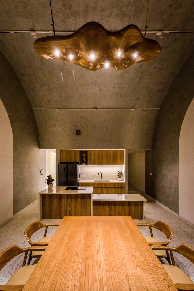Bên trong nhà có ba giếng trời giúp cải thiện lưu thông không khí trong nhà, tăng lượng ánh sáng và gió tự nhiên. Đây là những yếu tố cần thiết để làm hài hòa cảm xúc của những người sống ở đây. Ngôi nhà được chia thành nhiều khối với chiều cao khác nhau để tránh sự lặp lại trong một không gian quá dài.