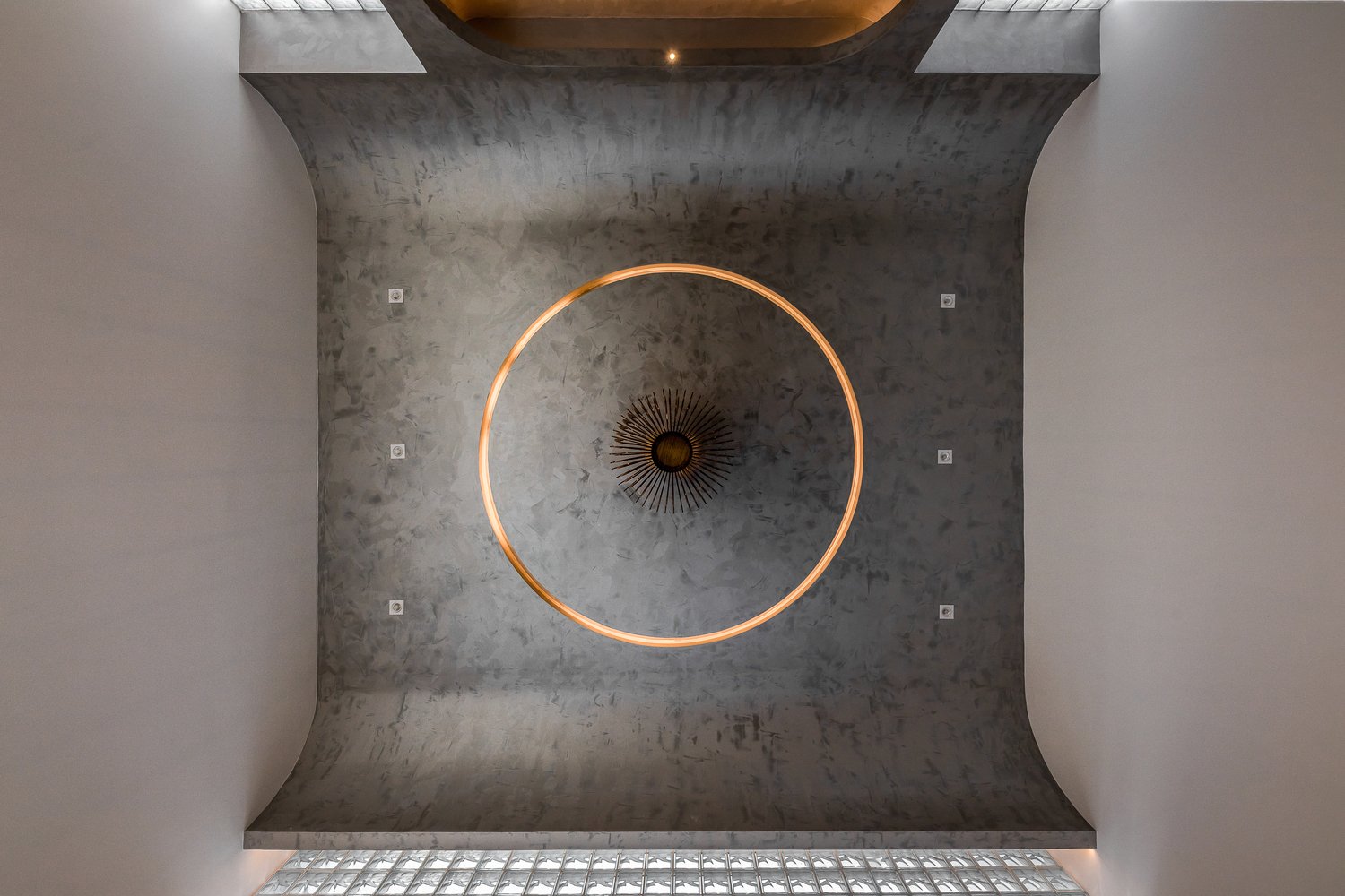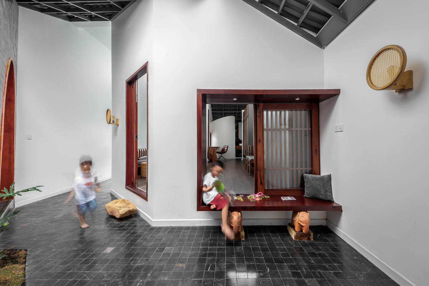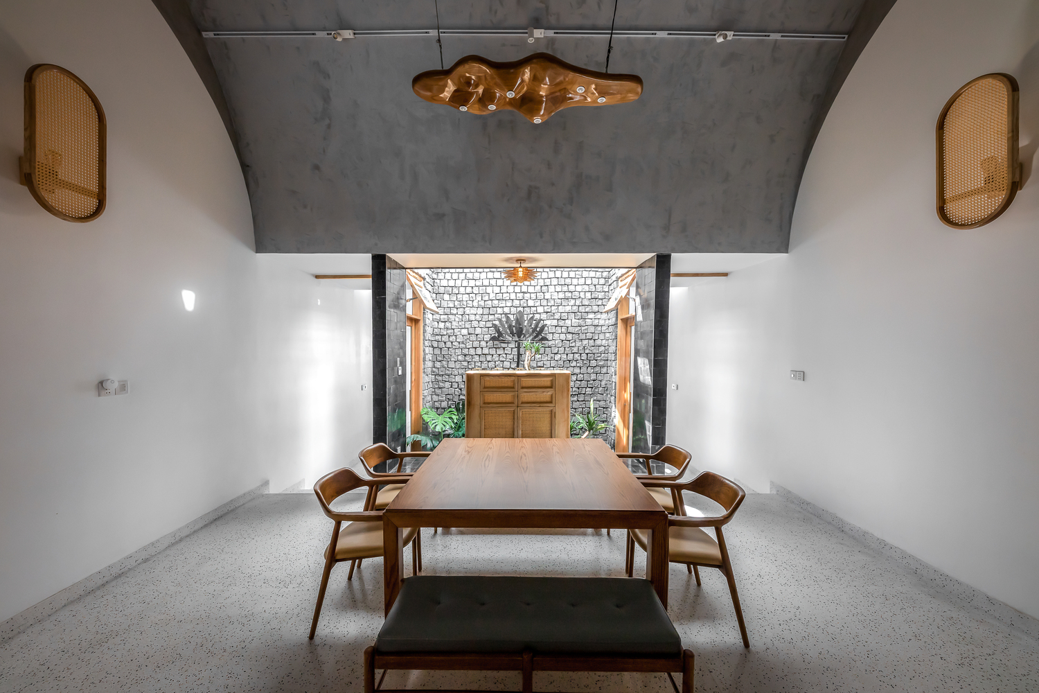 Bên trong nhà có ba giếng trời giúp cải thiện lưu thông không khí trong nhà, tăng lượng ánh sáng và gió tự nhiên. Đây là những yếu tố cần thiết để làm hài hòa cảm xúc của những người sống ở đây. Ngôi nhà được chia thành nhiều khối với chiều cao khác nhau để tránh sự lặp lại trong một không gian quá dài.