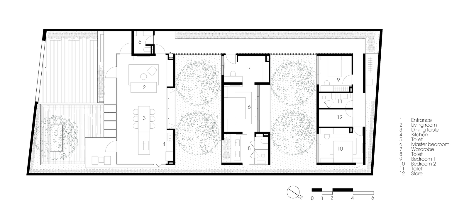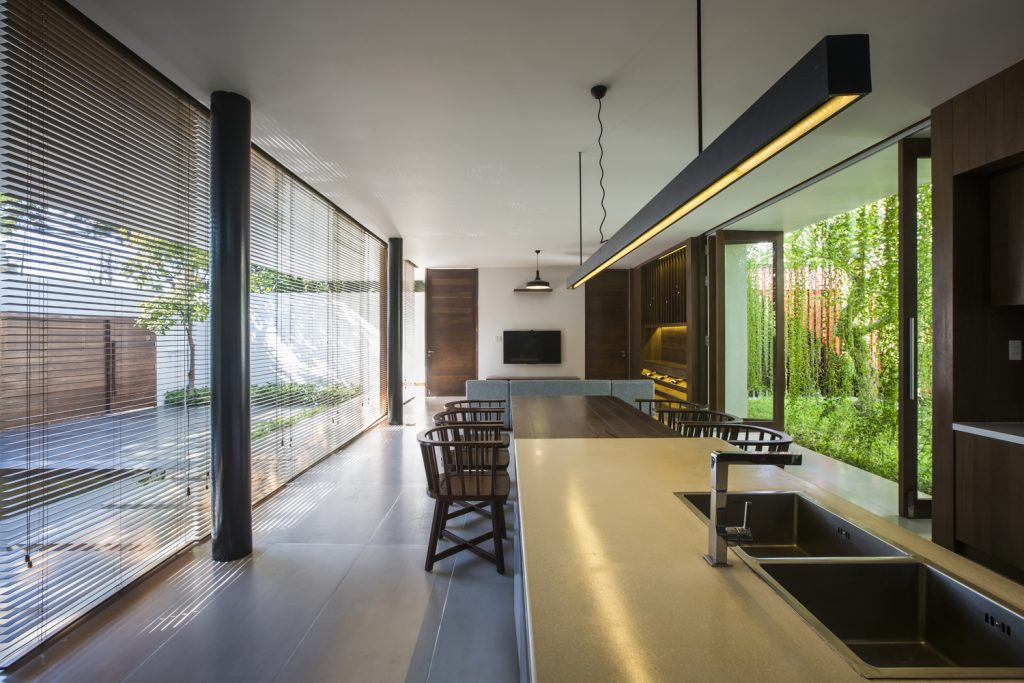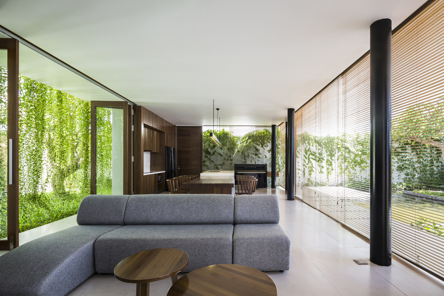 Ngôi nhà nằm trên mảnh đất rộng 470 mét vuông với 60% diện tích đất dành cho cảnh quan. 60% được sắp xếp một cách sáng tạo qua các vách ngăn để thiên nhiên không bao giờ khuất tầm mắt. Với 40% diện tích còn lại, các kiến trúc sư đã chia nó thành những “ngăn kéo” chứa các không gian chức năng, đồng thời chèn vào giữa chúng những “ngăn kéo cảnh quan”.