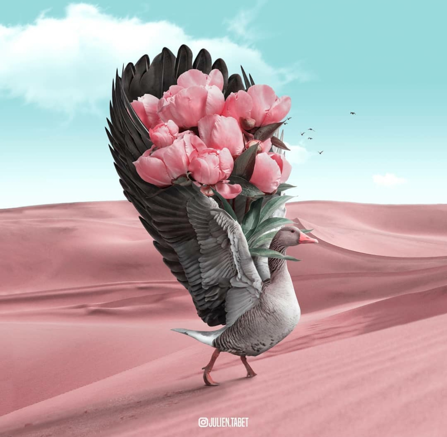 Tất cả các tác phẩm nghệ thuật của Julien đều được thực hiện bằng Photoshop, một trong những công cụ sáng tạo mạnh mẽ nhất của thế hệ chúng ta. Lấy cảm hứng từ những nghệ sĩ nổi tiếng với phong cách siêu thực như Magritte và Dali, Julien nghĩ rằng đó là cách tốt nhất để chia sẻ ý tưởng những ý tưởng và trí tưởng tượng có phần điên rồ của mình.
