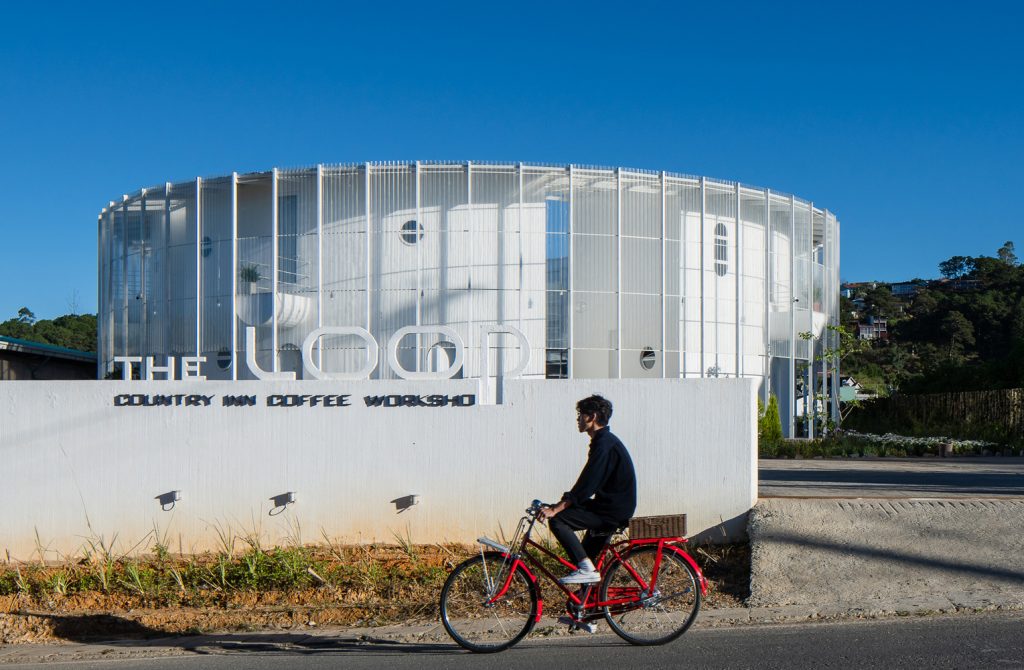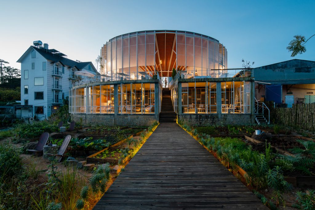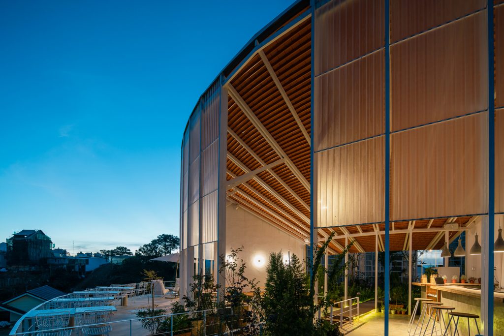Khu vực café được chia thành hai phần. Phần trên là khu vực bán ngoài trời, một phần có mái ngói che, phần còn lại nhìn xuống thung lũng bên dưới. Du khách có thể trải nghiệm sự tối giản cũng như bố cục không gian rõ ràng đồng thời có thể ngắm nhìn cảnh quan đẹp nhất.