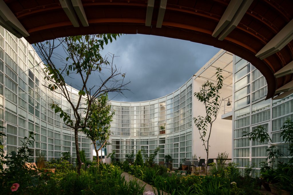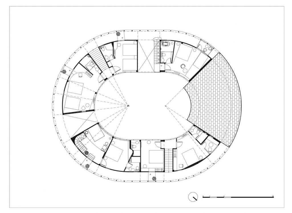 Có 12 phòng trong khu vực khách sạn, mỗi phòng đều khác biệt về mọi mặt nhờ cấu trúc hình tròn của tòa nhà. Tất cả các phòng đều có hướng nhìn ra đồi, rừng thông hoặc khu vườn ở trung tâm. Với màu trắng làm chủ đạo, nội thất trong mỗi phòng đều được tối giản hóa, loại bỏ tất cả đồ đạc không cần thiết, giúp tăng cường nguồn ánh sáng tự nhiên.