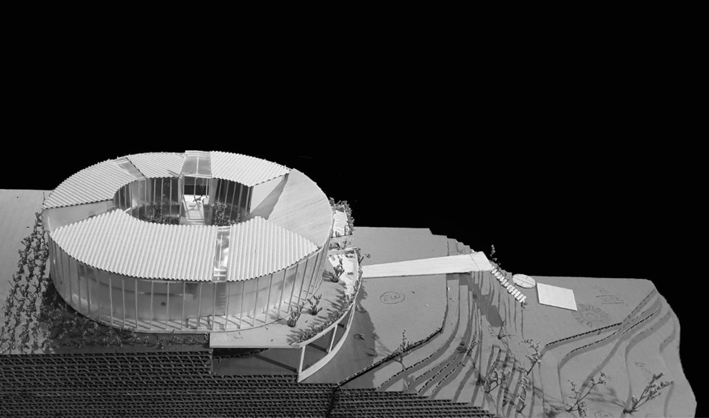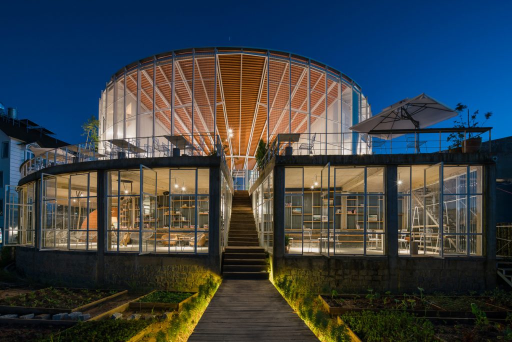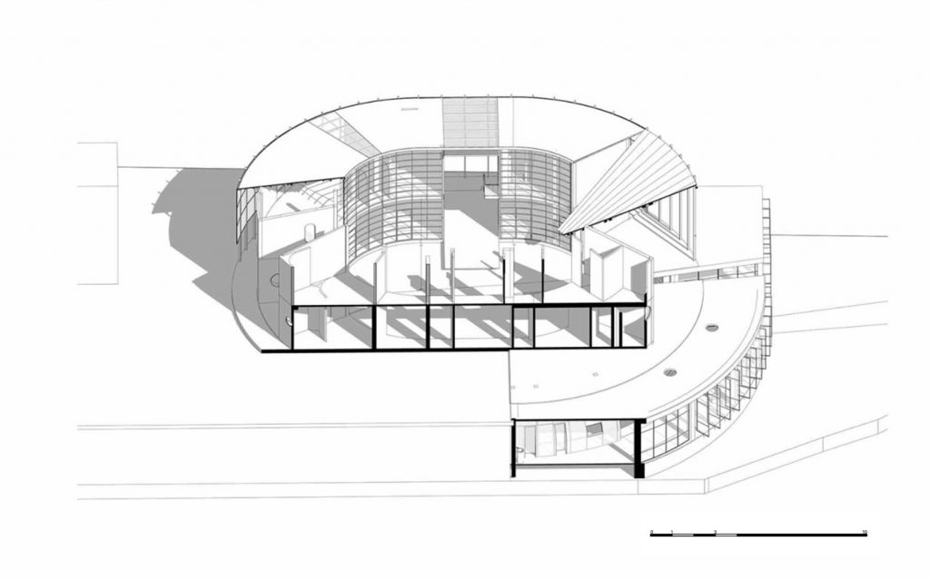 Phần dưới là một quán cà phê được bao phủ bằng kính, kết nối con đường đi bộ với bên trong tòa nhà cũng như khu vườn bên dưới. Các chỗ ngồi trong quán cà phê được xếp thành những chiếc ghế dài giống như hang động, tất cả đều nhìn ra thung lũng và khu vườn bên dưới.