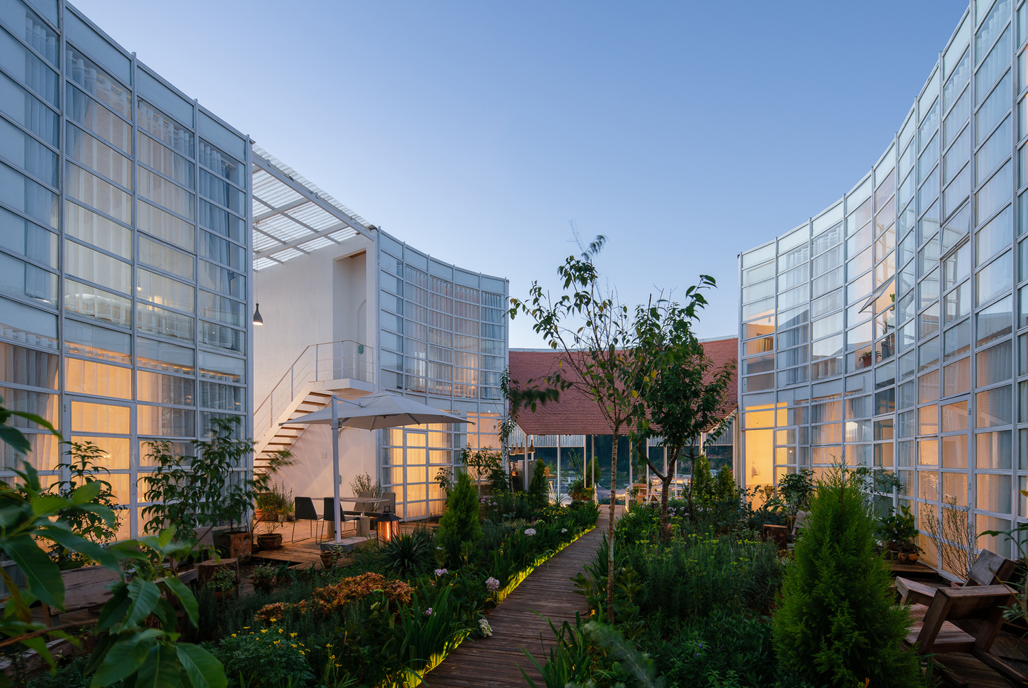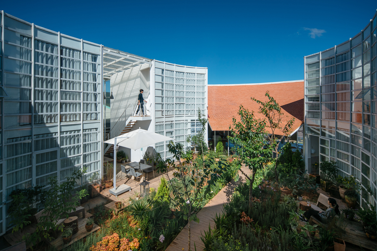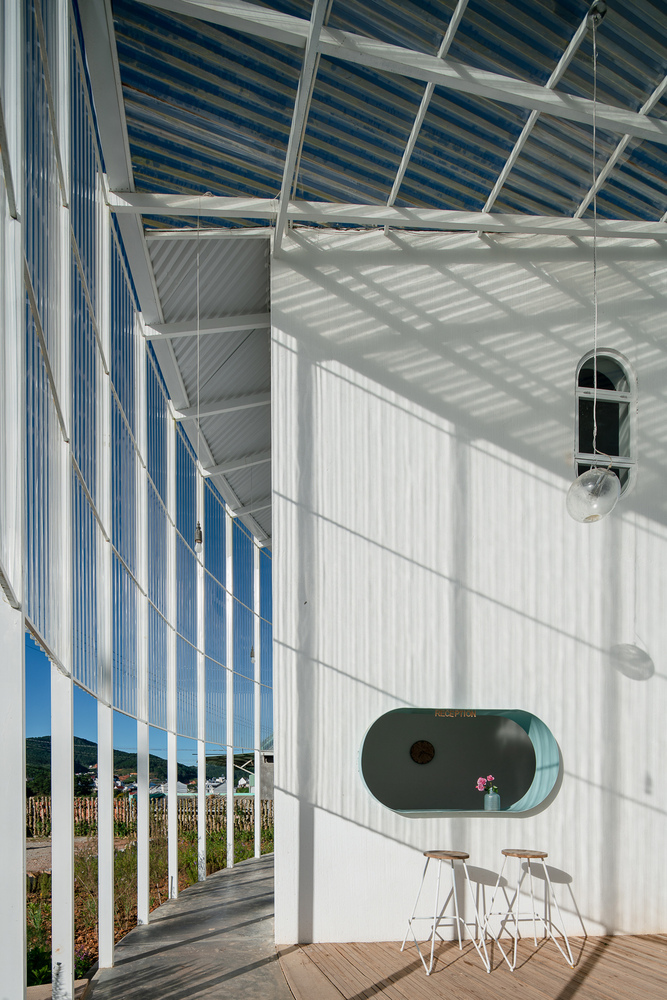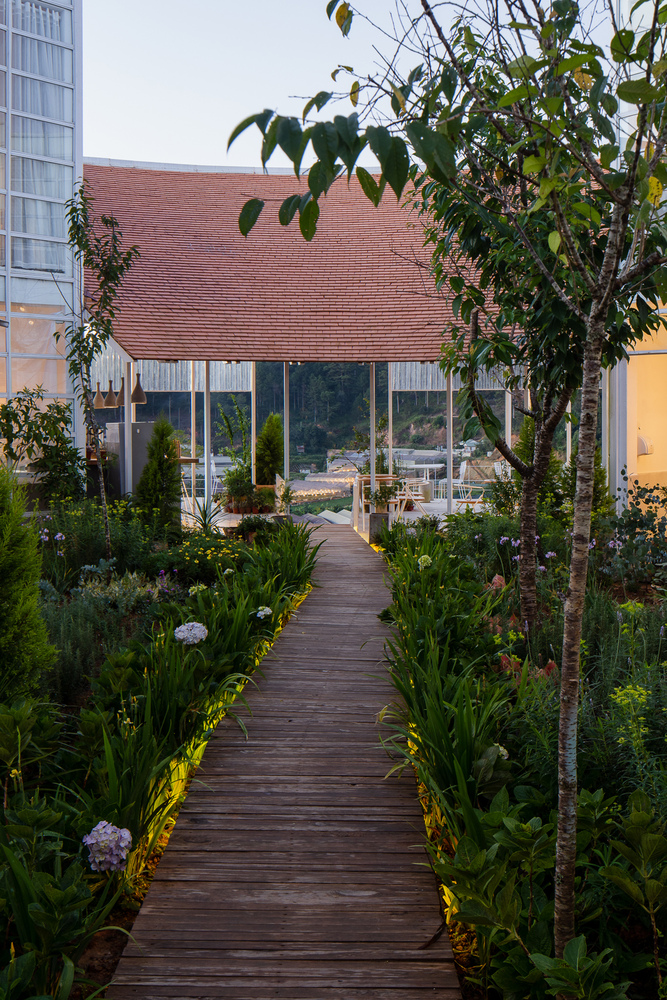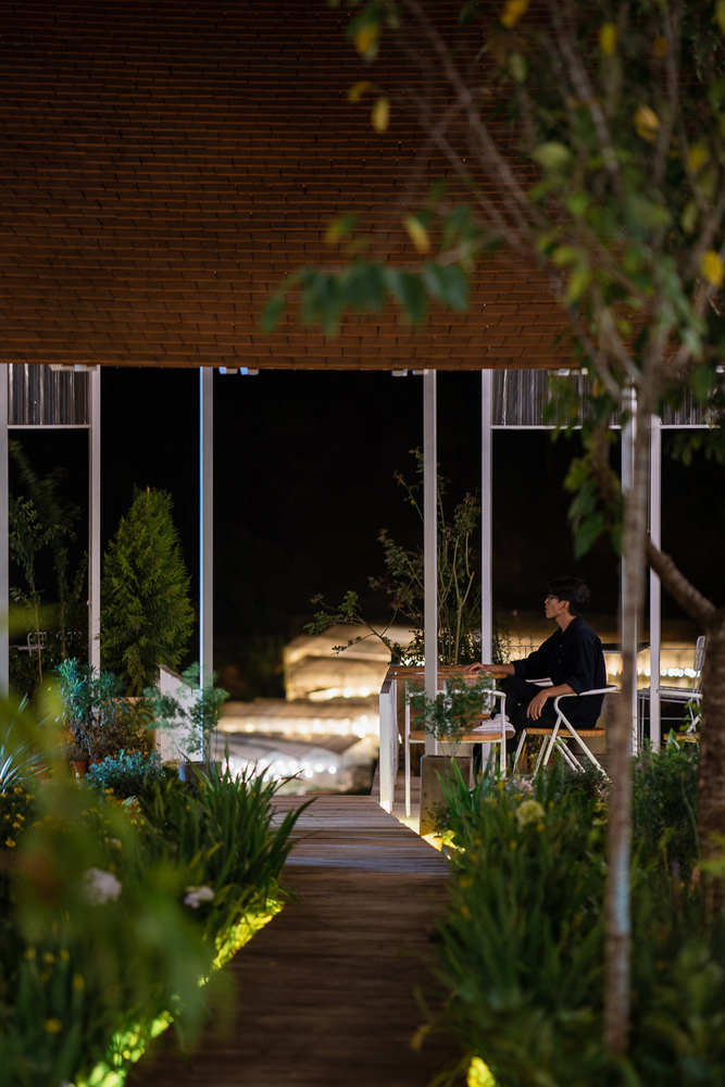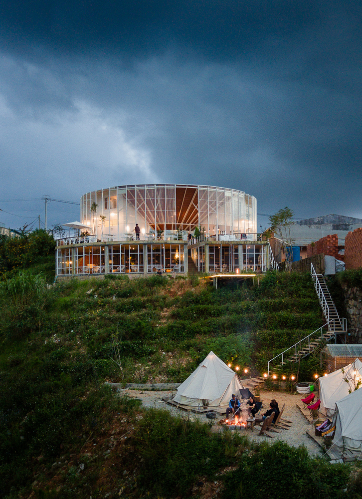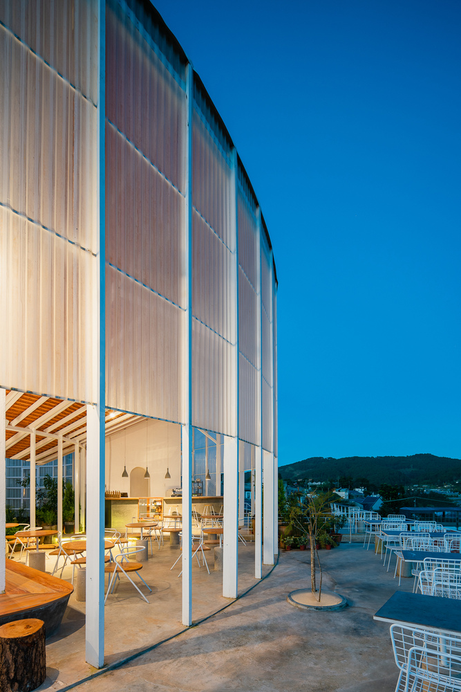 Khu vực café được chia thành hai phần. Phần trên là khu vực bán ngoài trời, một phần có mái ngói che, phần còn lại nhìn xuống thung lũng bên dưới. Du khách có thể trải nghiệm sự tối giản cũng như bố cục không gian rõ ràng đồng thời có thể ngắm nhìn cảnh quan đẹp nhất.