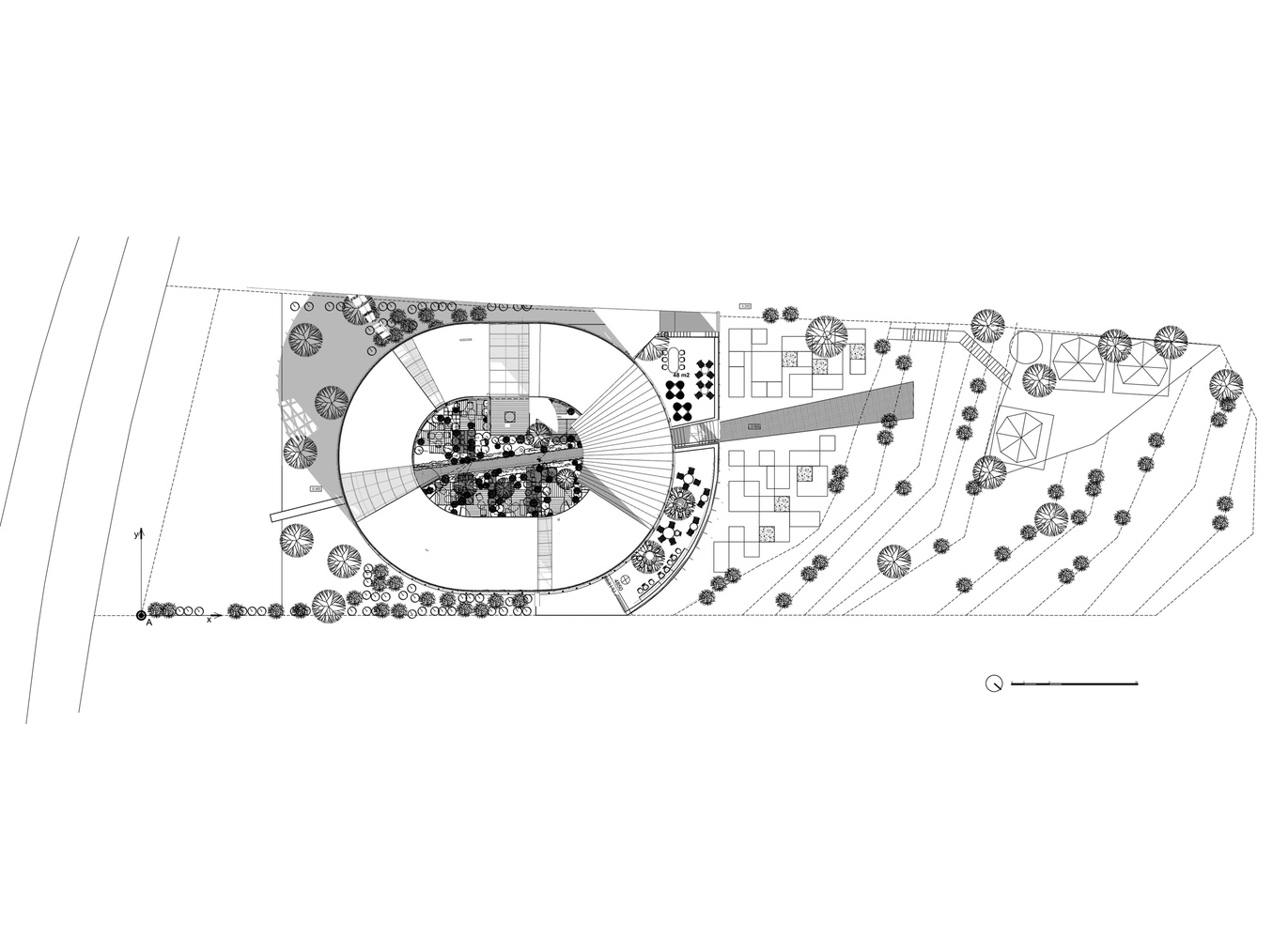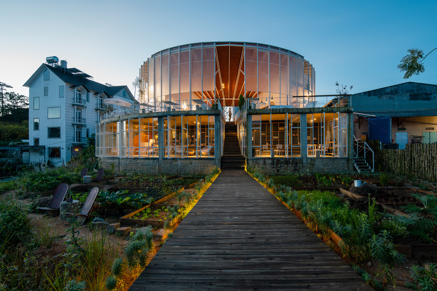 Phần dưới là một quán cà phê được bao phủ bằng kính, kết nối con đường đi bộ với bên trong tòa nhà cũng như khu vườn bên dưới. Các chỗ ngồi trong quán cà phê được xếp thành những chiếc ghế dài giống như hang động, tất cả đều nhìn ra thung lũng và khu vườn bên dưới.