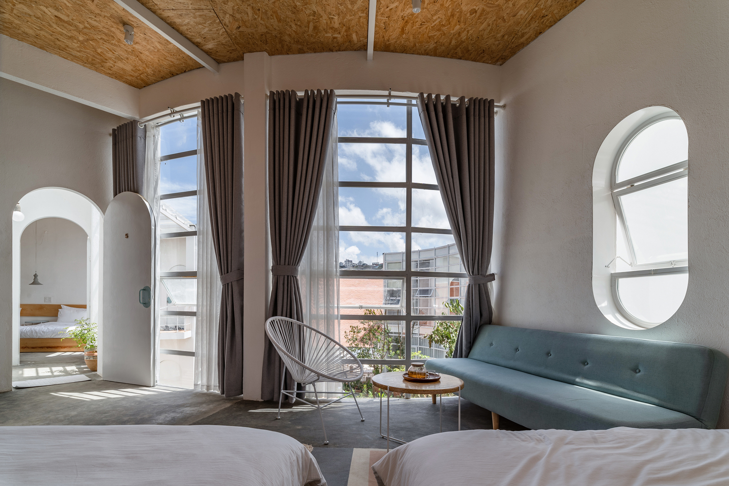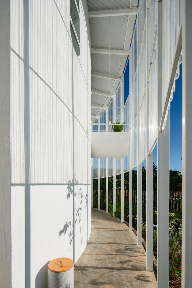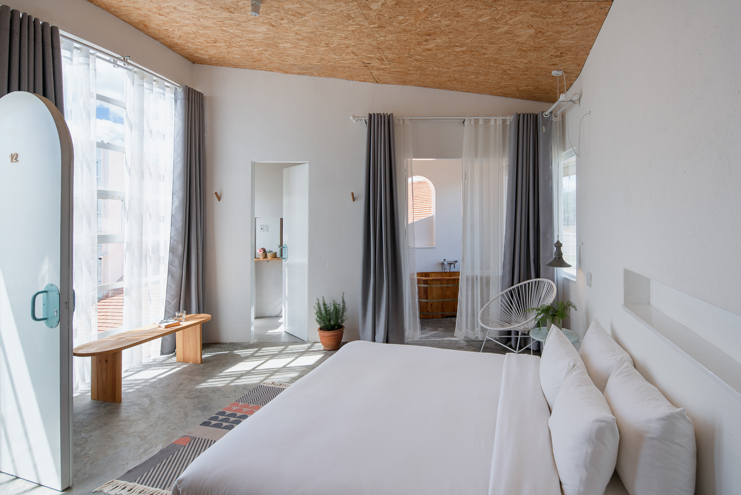 Có 12 phòng trong khu vực khách sạn, mỗi phòng đều khác biệt về mọi mặt nhờ cấu trúc hình tròn của tòa nhà. Tất cả các phòng đều có hướng nhìn ra đồi, rừng thông hoặc khu vườn ở trung tâm. Với màu trắng làm chủ đạo, nội thất trong mỗi phòng đều được tối giản hóa, loại bỏ tất cả đồ đạc không cần thiết, giúp tăng cường nguồn ánh sáng tự nhiên.