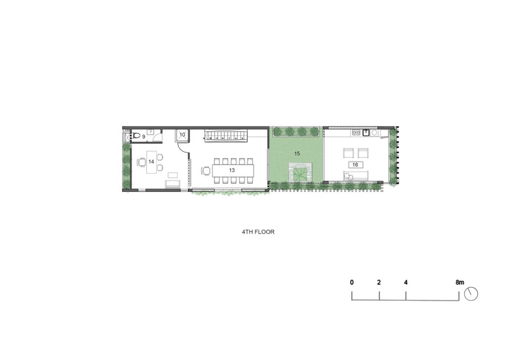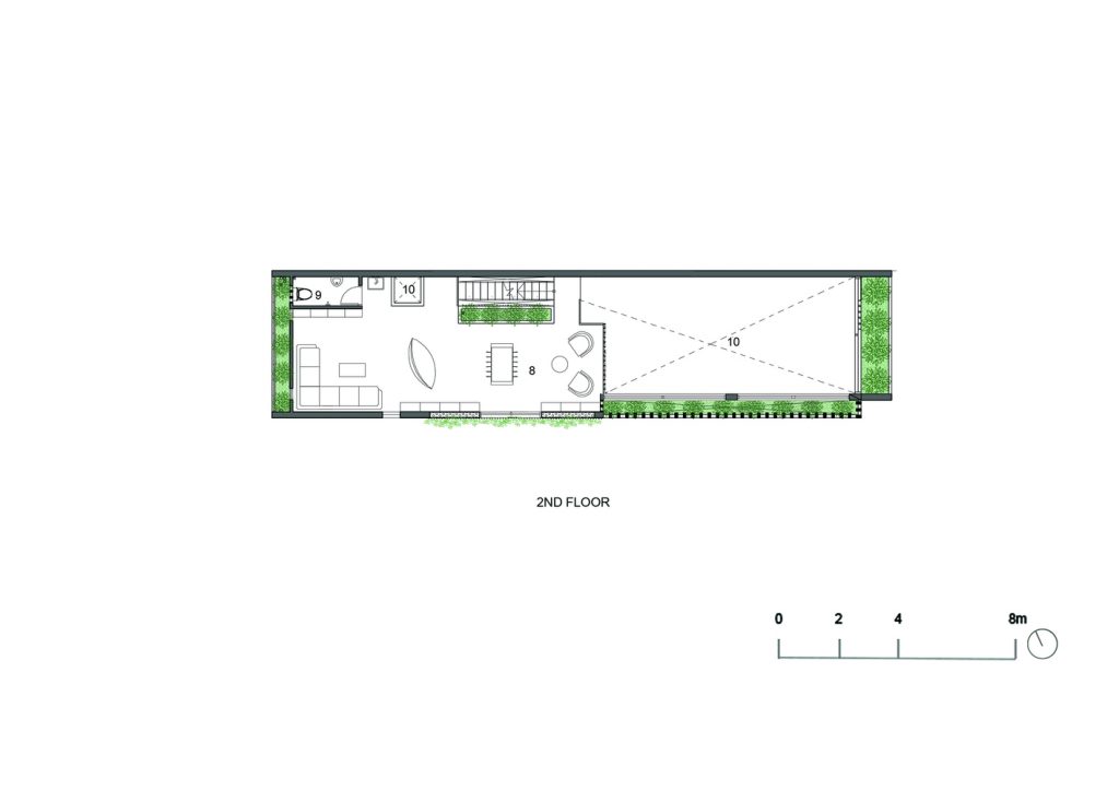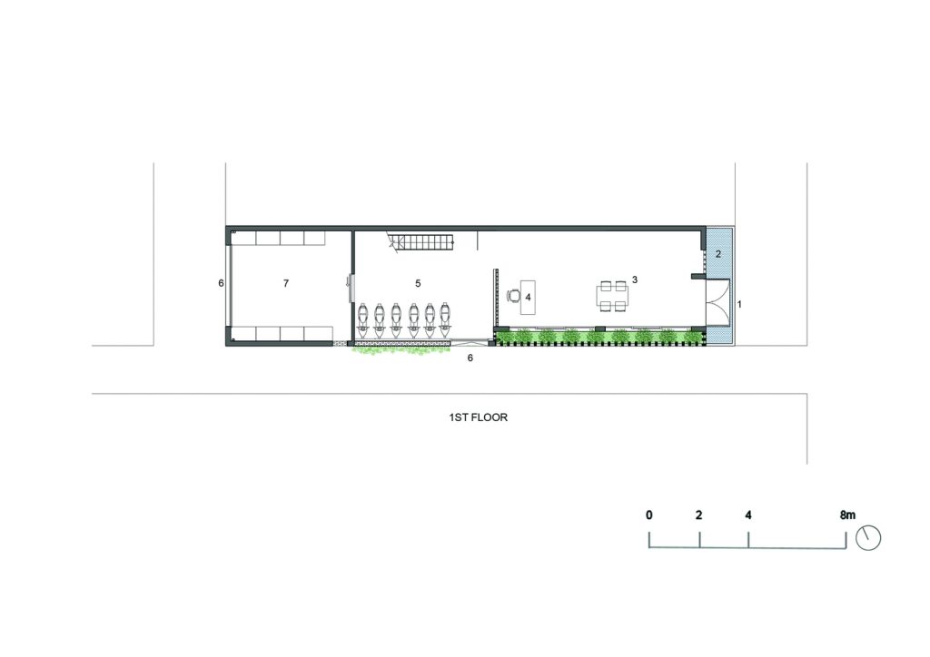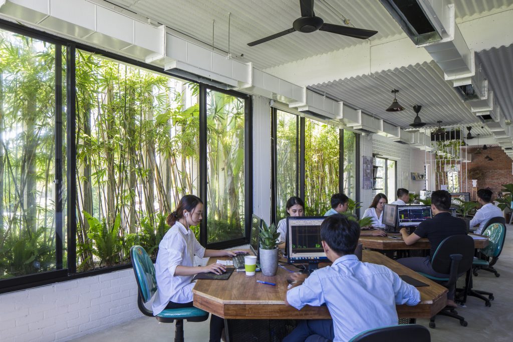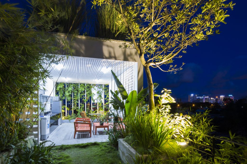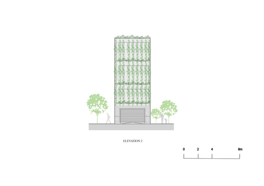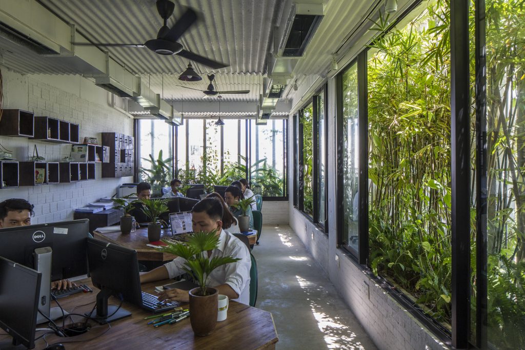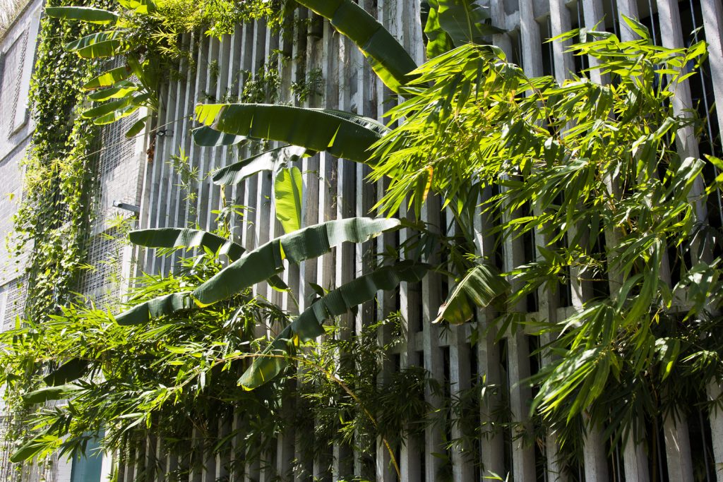 Những cây chuối, cây bụi vàng và các loài cây bản địa xung quanh được trồng ở tầng một của văn phòng. Phía Tây Nam ngôi nhà được xây dựng bằng bê tông trang trí với các thanh nan để tránh nắng nóng và cho phép luồng gió từ biển thổi vào.