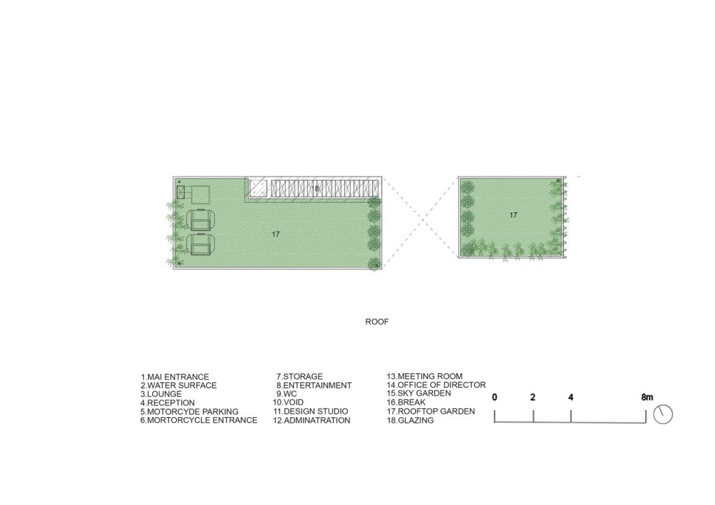 Tầng thượng được trồng dày đặc các loại cỏ và các loại cây khác để làm mát cho các tầng dưới. Tầng này có văn phòng điều hành, phòng họp và phòng ăn trưa rộng mở với một nhà bếp hoàn chỉnh. Hàng rào cây hoa bao quanh những khoảng đất thoáng tạo bóng mát cũng như vẻ đẹp. Đây là một nơi với hệ thống thông gió tự nhiên, cây trồng dễ chịu và môi trường thoải mái cho khách hàng và nhân viên.
