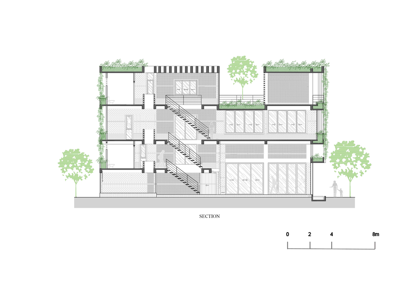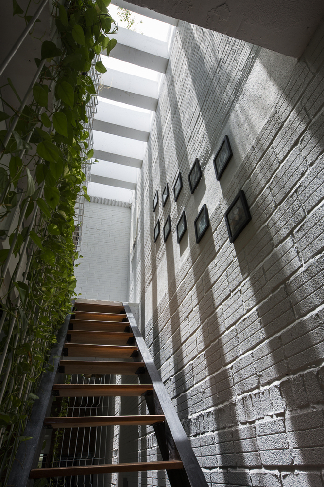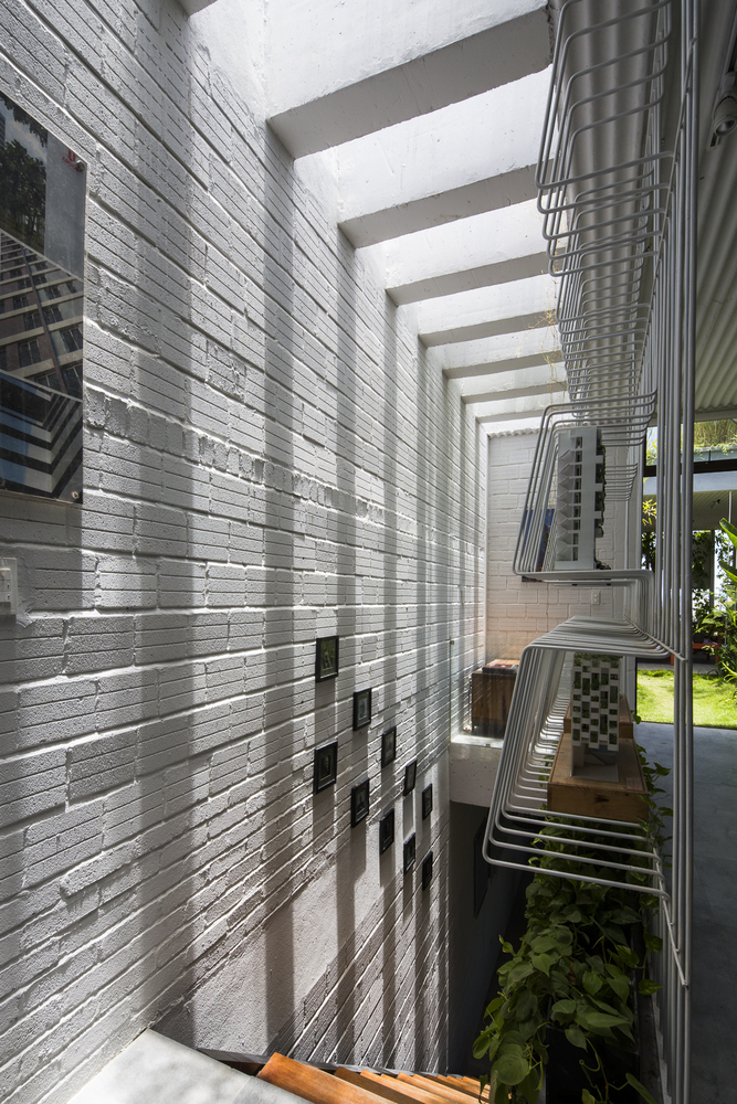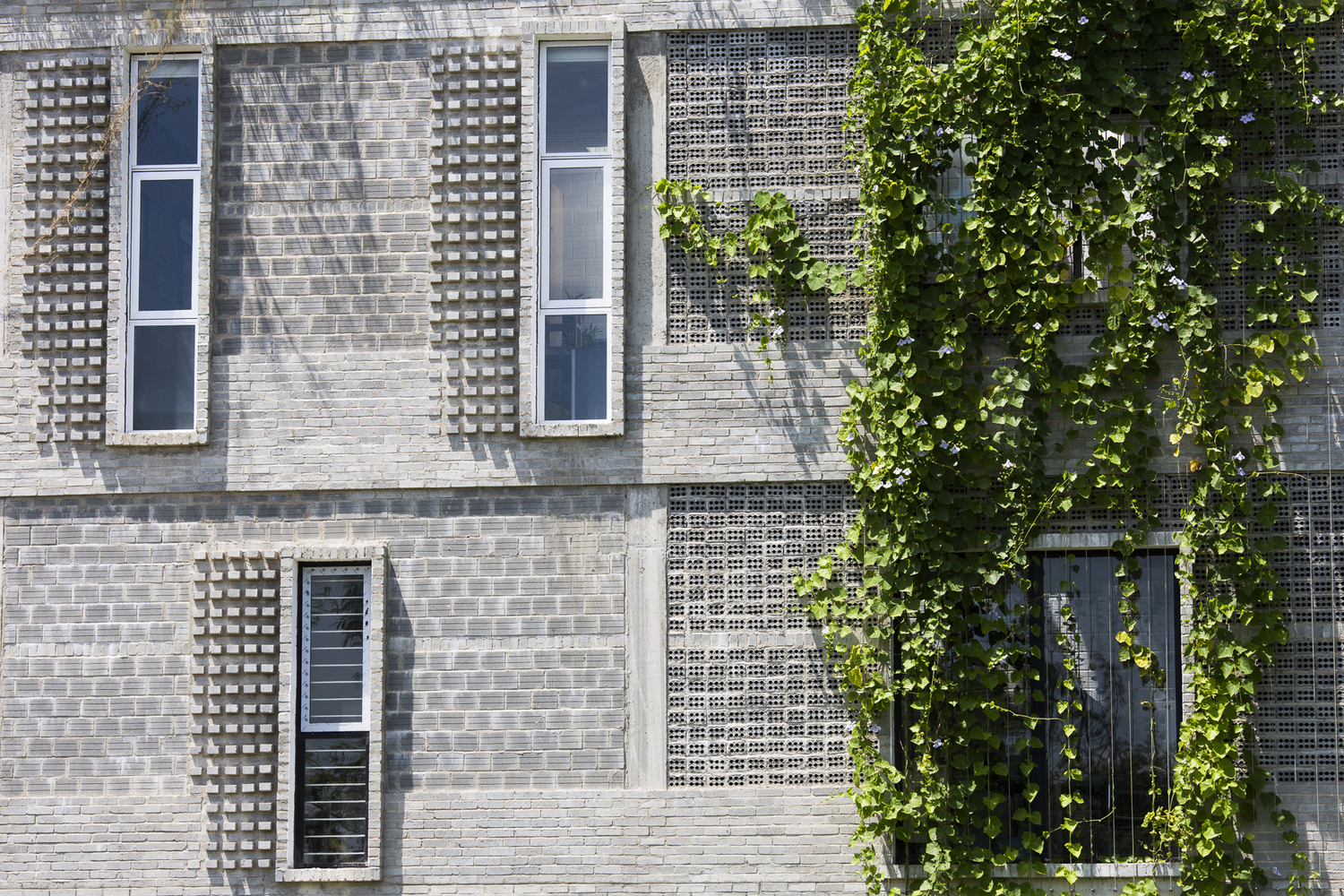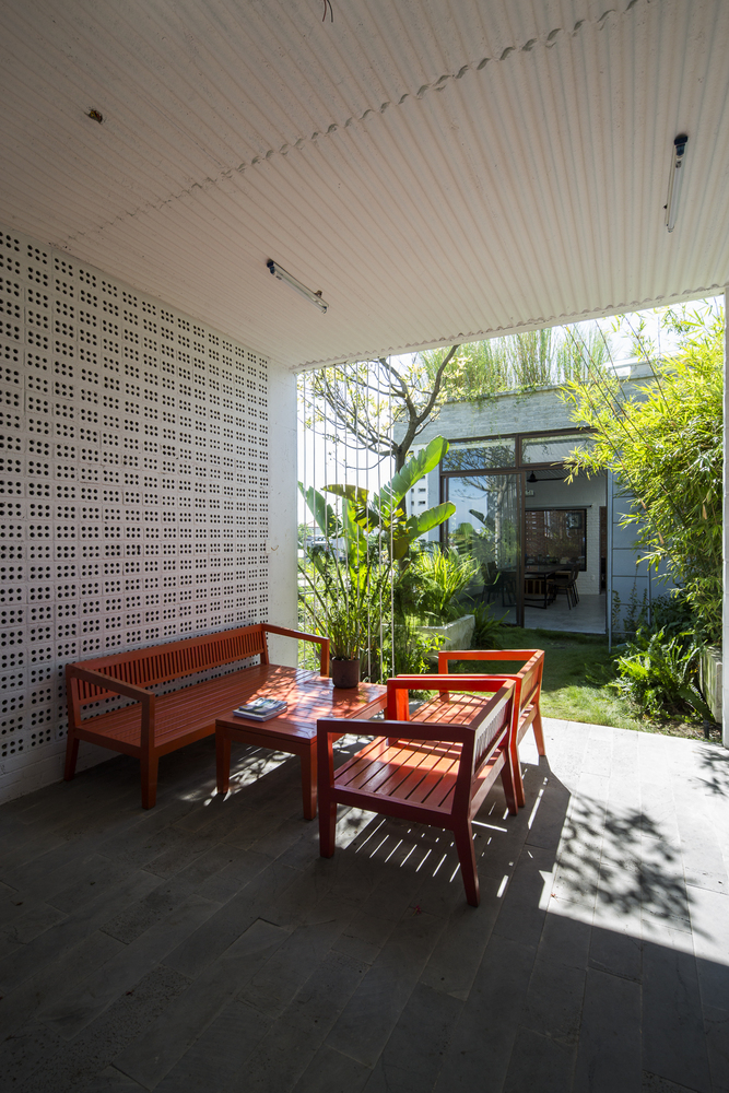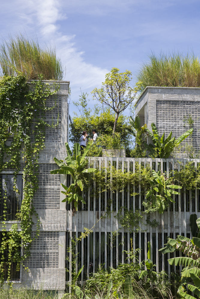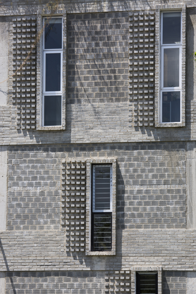 Để tái tạo không khí của một ngôi nhà nông thôn, KTS đã sử dụng gạch không nung. Sàn nhà được lát gạch bê tông trang trí với tông màu xám nhạt. Các mái nhà xi măng xuất hiện như một giàn giáo tương tự như phương pháp xây dựng ở nông thôn. Điều này tạo ra chiều sâu vì cấu trúc 3 chiều của nó. Một tòa nhà hiện đại với cảm giác không tuổi.
