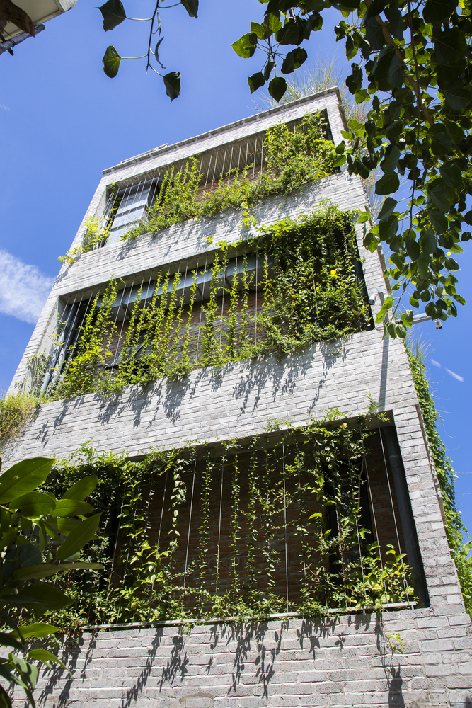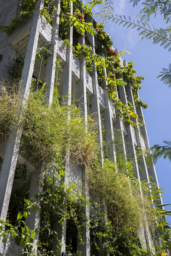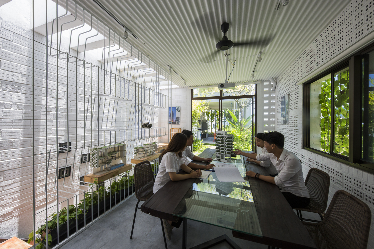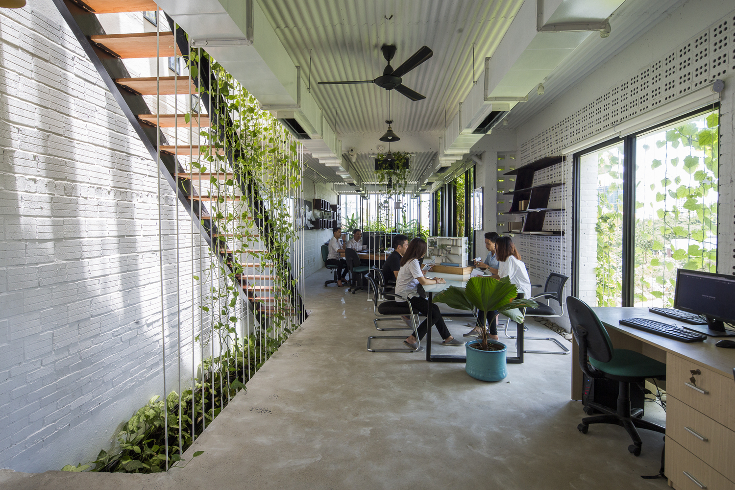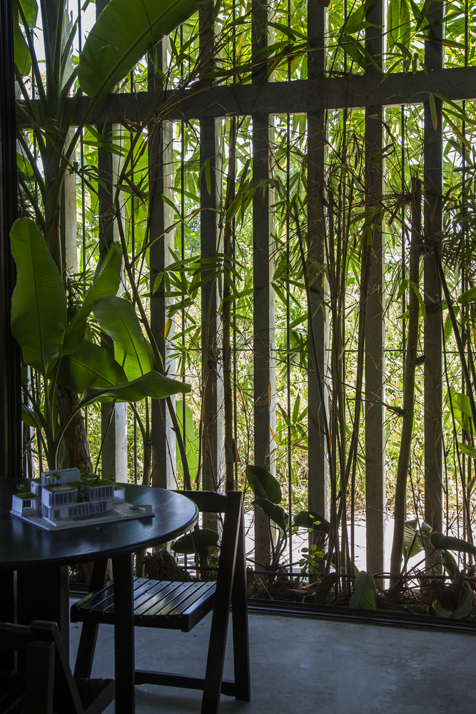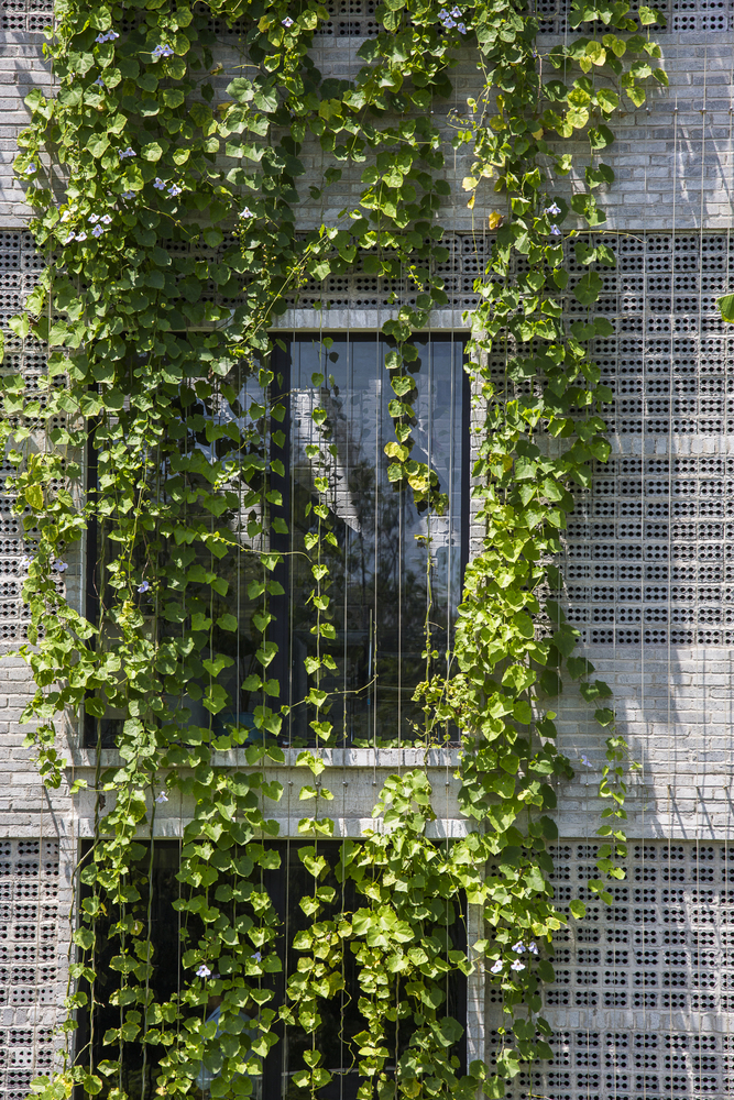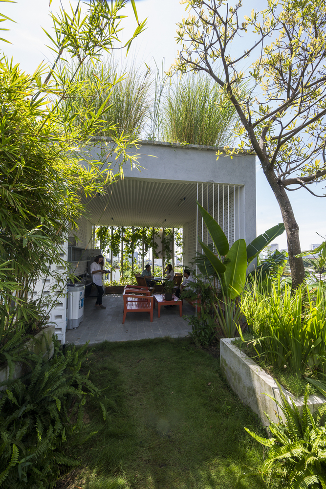 Những cây chuối, cây bụi vàng và các loài cây bản địa xung quanh được trồng ở tầng một của văn phòng. Phía Tây Nam ngôi nhà được xây dựng bằng bê tông trang trí với các thanh nan để tránh nắng nóng và cho phép luồng gió từ biển thổi vào.