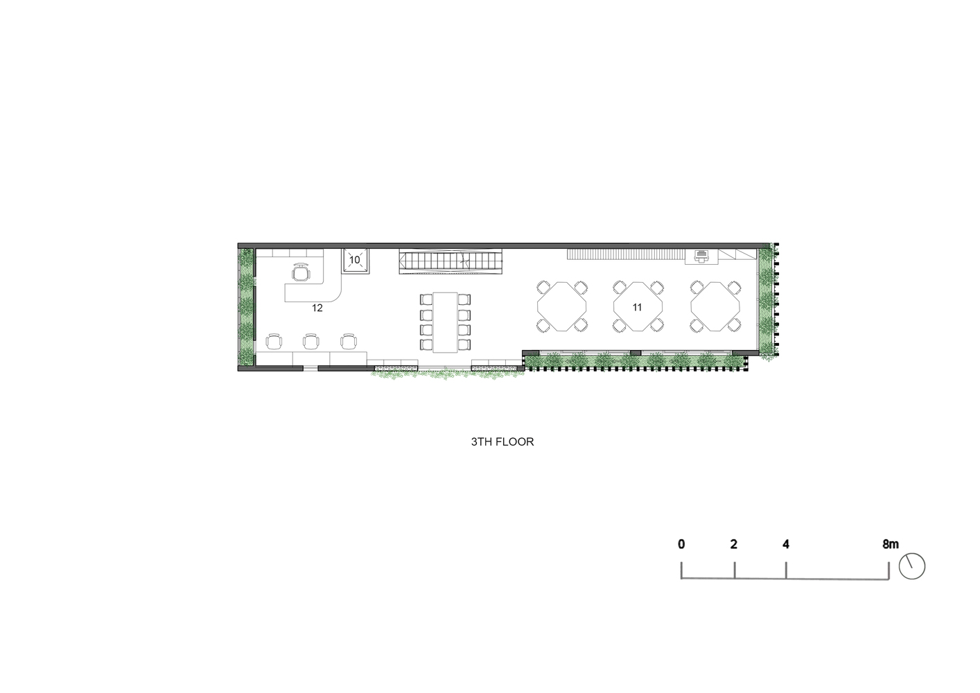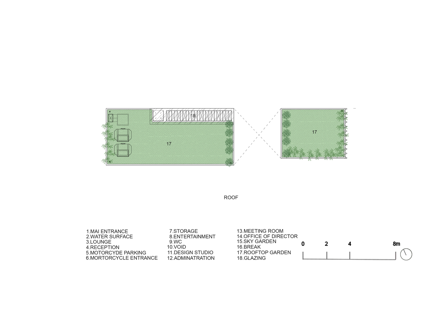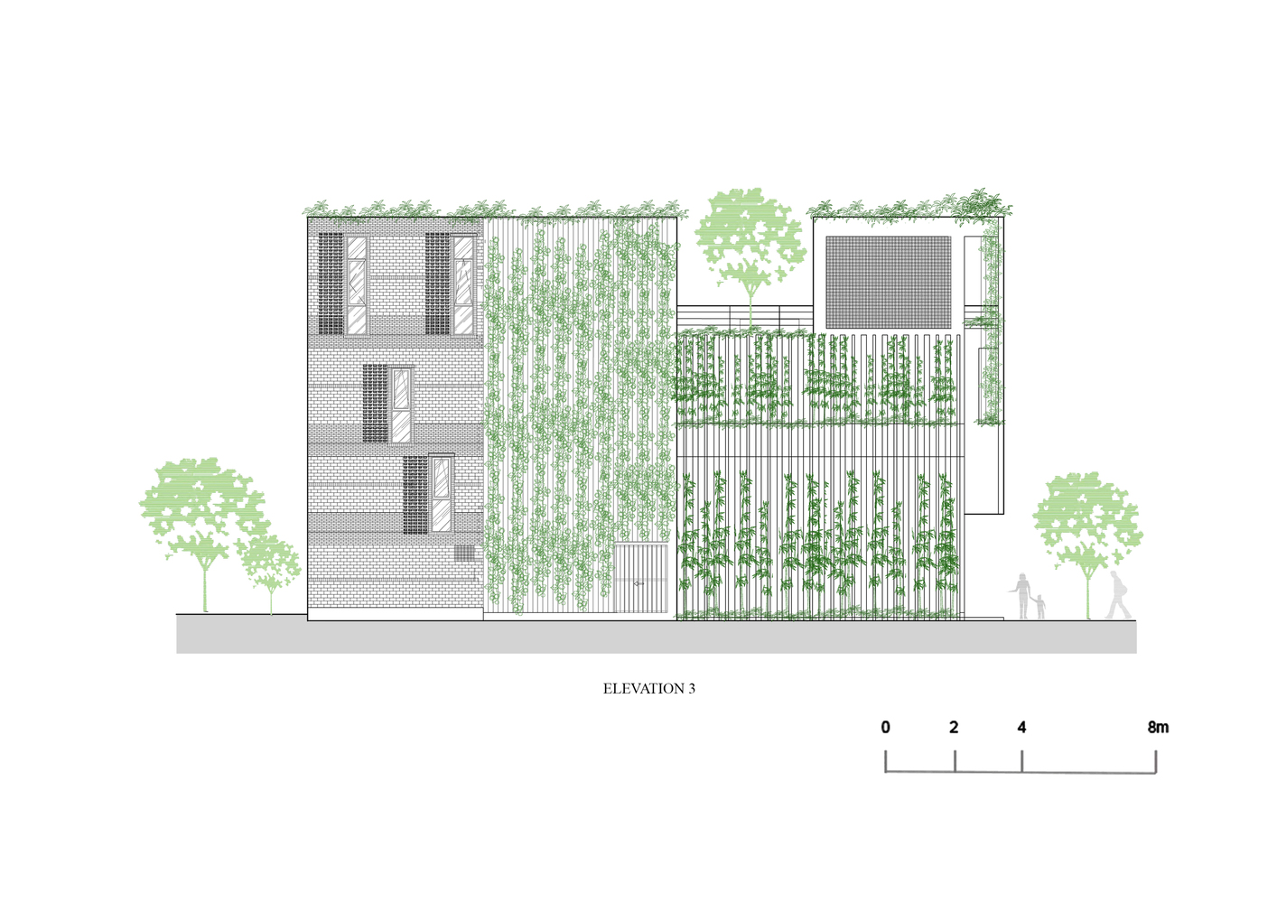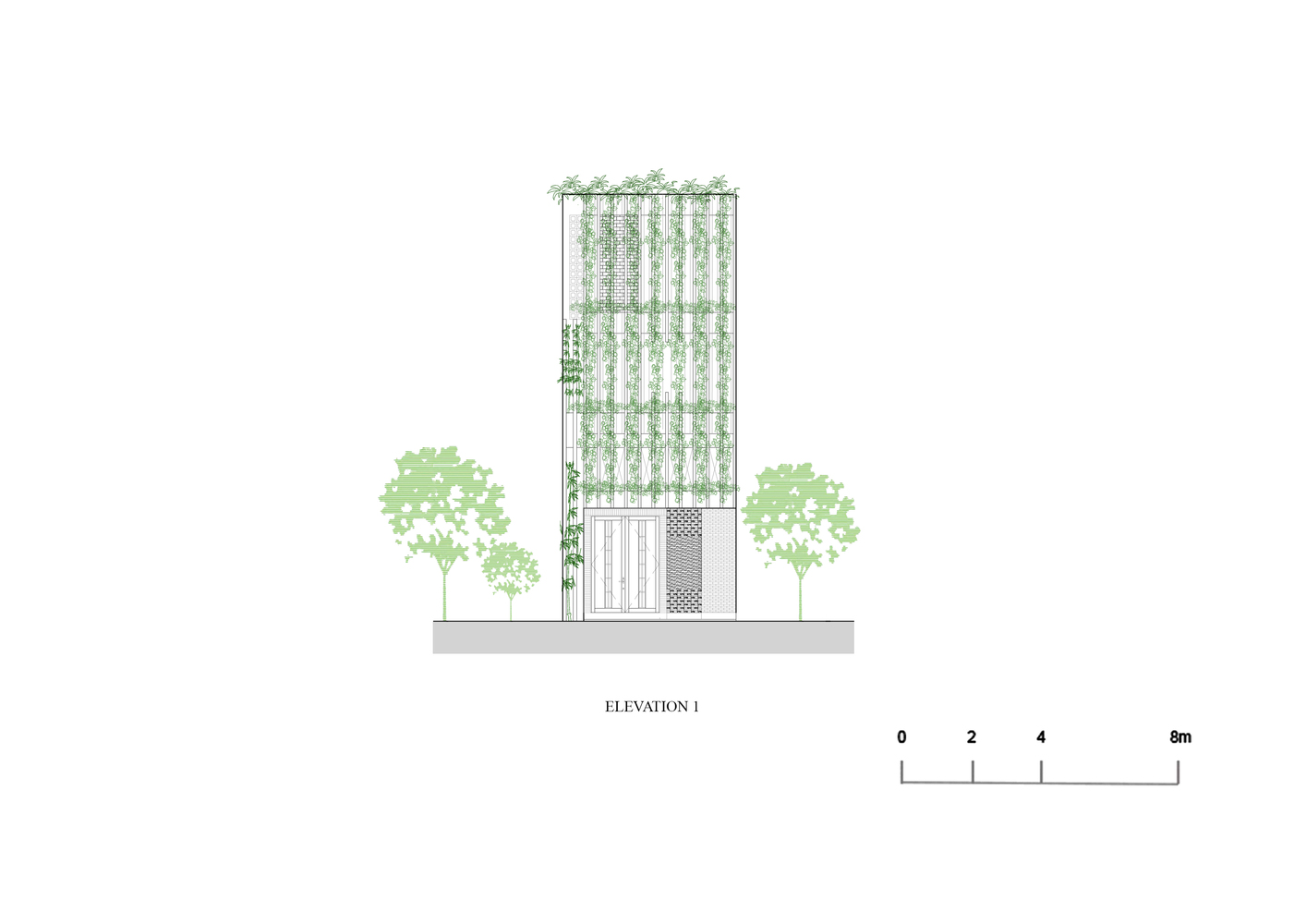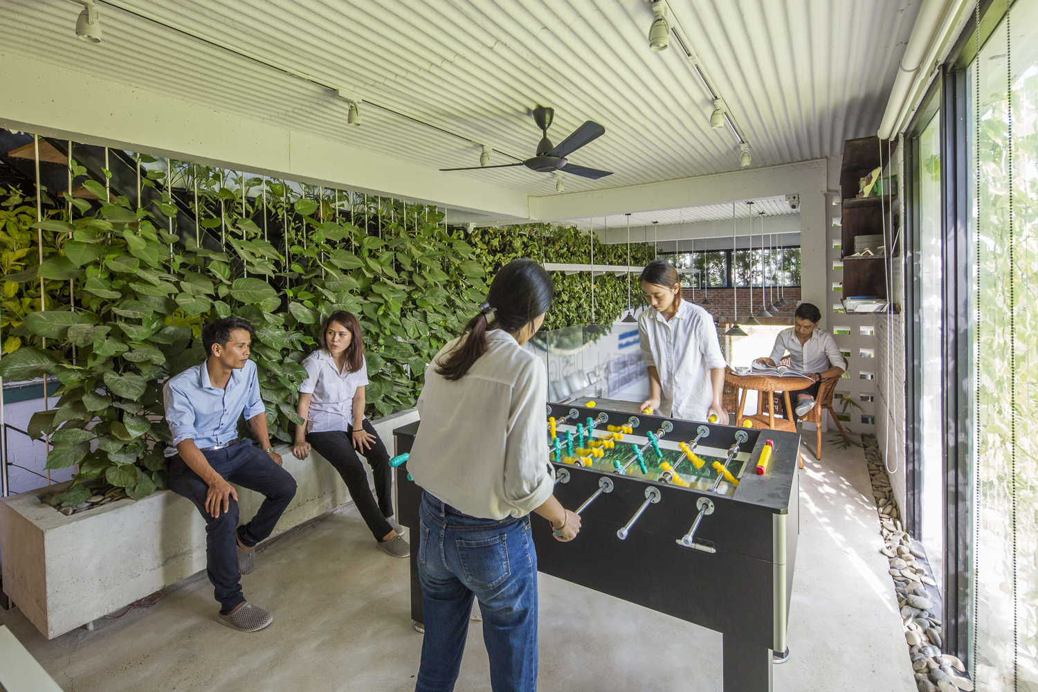 Những cây chuối, cây bụi vàng và các loài cây bản địa xung quanh được trồng ở tầng một của văn phòng. Phía Tây Nam ngôi nhà được xây dựng bằng bê tông trang trí với các thanh nan để tránh nắng nóng và cho phép luồng gió từ biển thổi vào.
