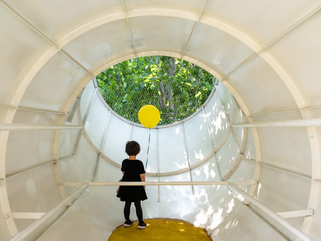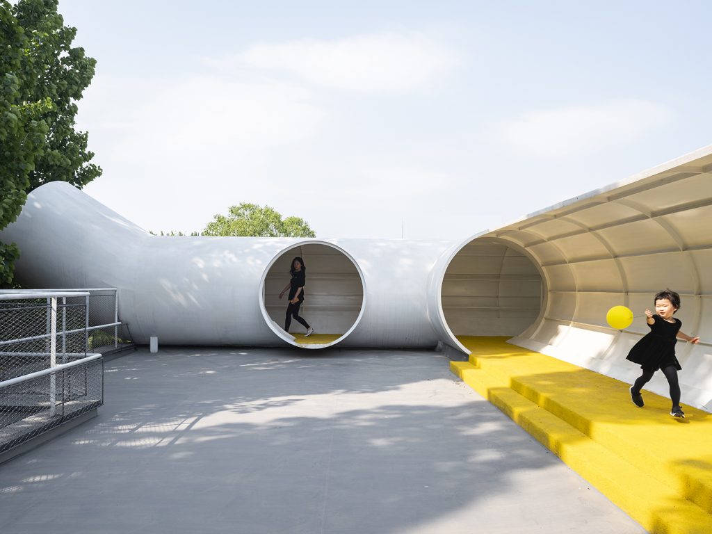 Các ống màu trắng với nhiều kích cỡ khác nhau bao quanh sân, tạo điều kiện thuận lợi cho một loạt các lối đi và các tuyến đường đa dạng liên kết tất cả các không gian khác nhau với nhau, khuyến khích trẻ em quyết định và chọn những con đường chúng muốn đi, kể cả những con đường ít quen thuộc.
