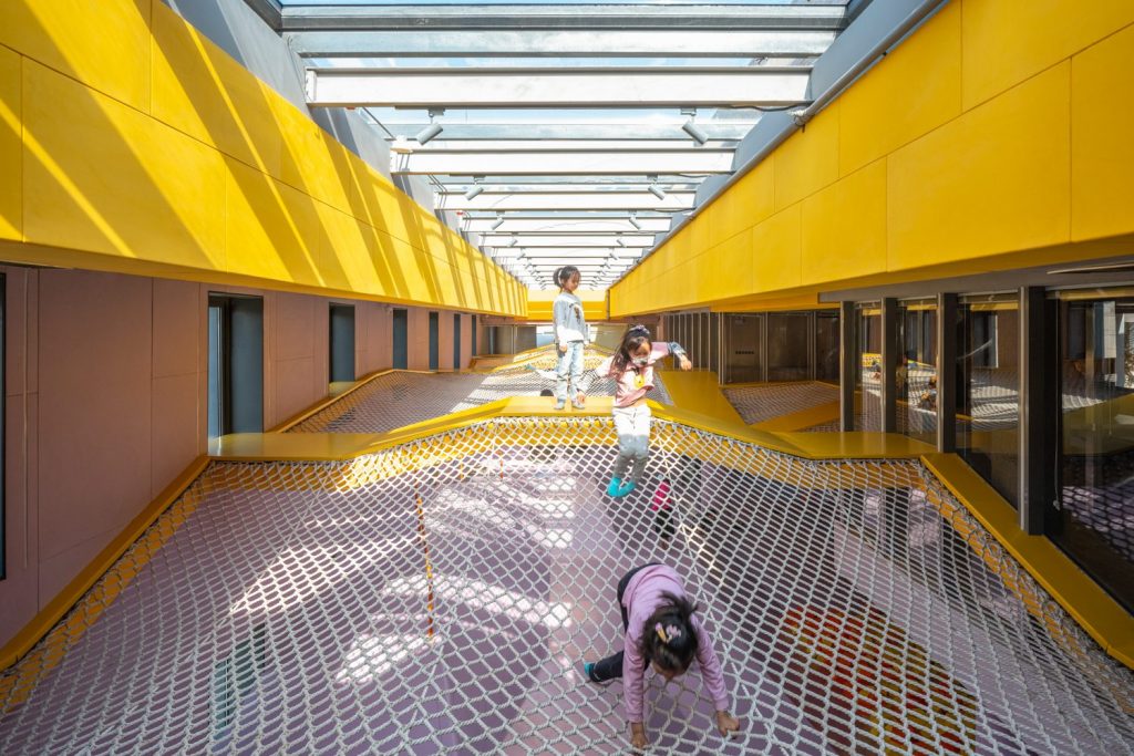 Sàn nhà được bao phủ bằng chất liệu cao su màu nâu đất để trẻ chạy xung quanh một cách an toàn, thiết kế cũng khuyến khích trẻ khám phá bằng cách leo lên và xuống dốc đồng thời tương tác với không gian. Mái dốc có chức năng giống như một nửa mặt tiền, với các khe hở dẫn trẻ em vào bên trong tòa nhà, cho phép chúng chạy ra vào tự do.