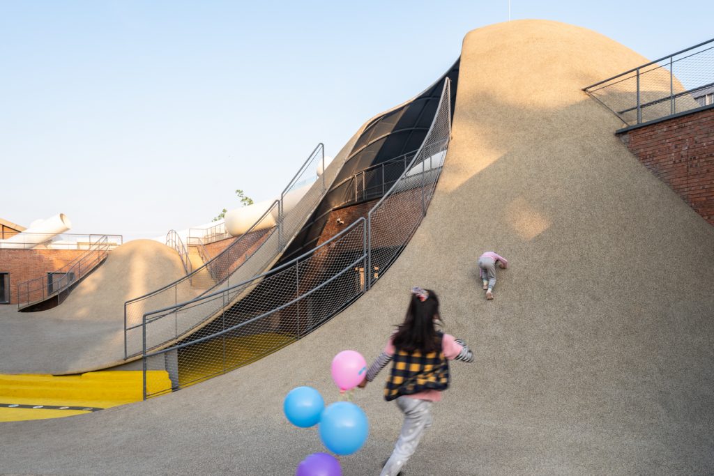 Với ý tưởng rằng ‘vui chơi’ là một công cụ quan trọng trong việc mang lại sự cân bằng cho trải nghiệm học tập của trẻ em, kiến trúc sư đã thiết kế sân trung tâm thành một cảnh quan đồi núi với các mức độ nghiêng khác nhau.