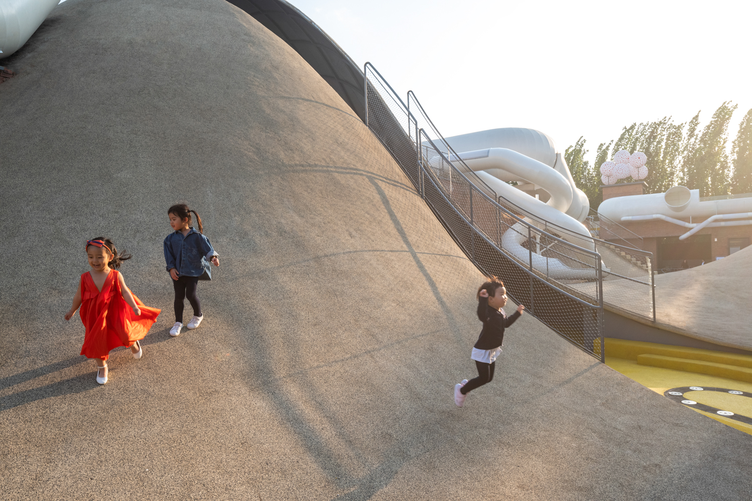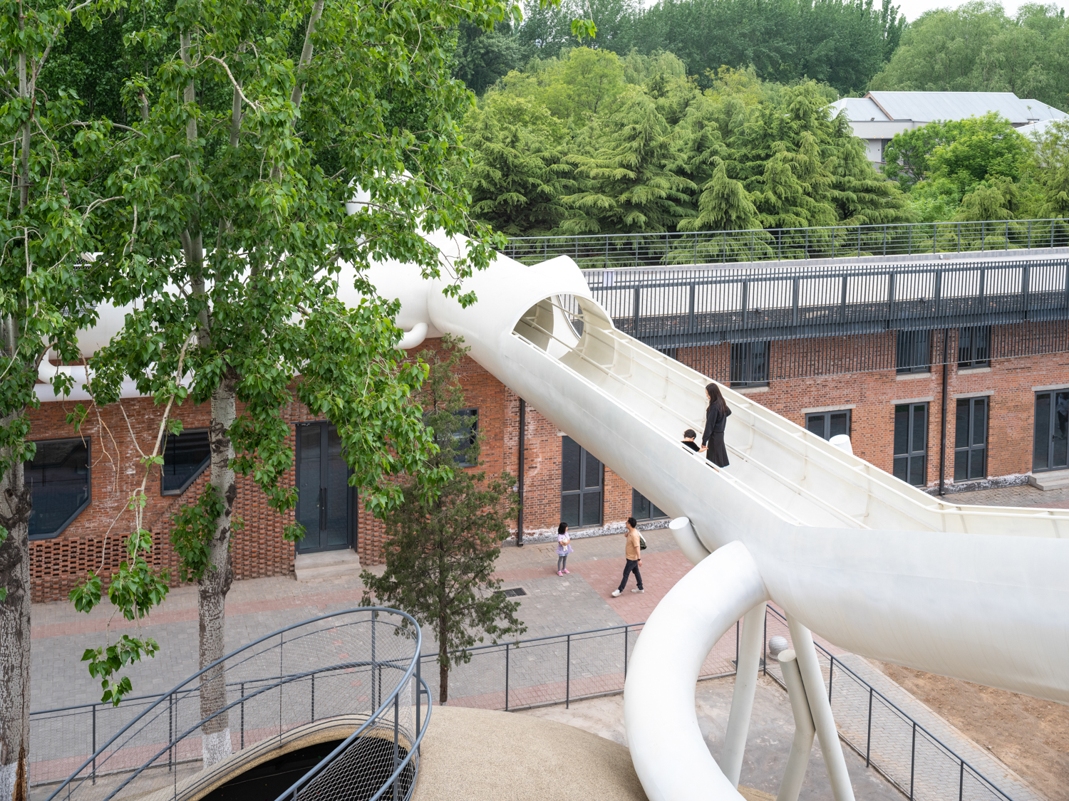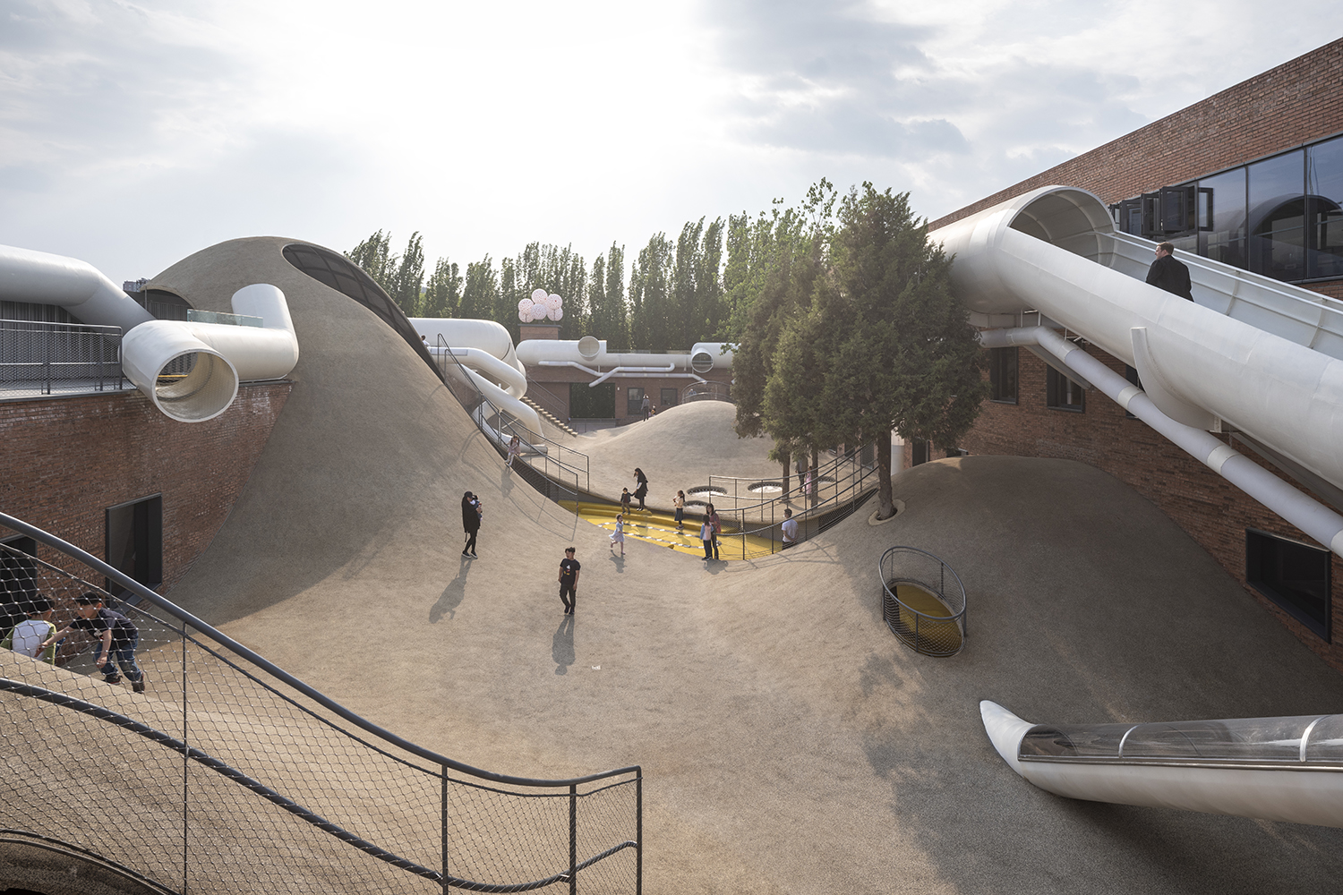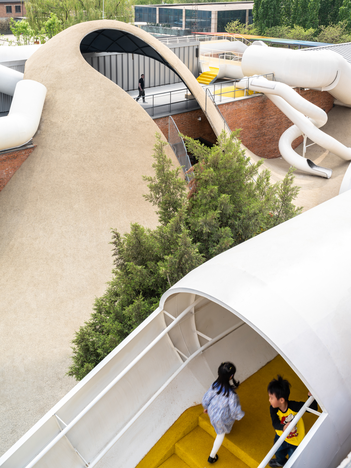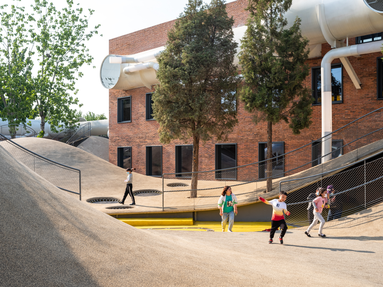 Các ống màu trắng với nhiều kích cỡ khác nhau bao quanh sân, tạo điều kiện thuận lợi cho một loạt các lối đi và các tuyến đường đa dạng liên kết tất cả các không gian khác nhau với nhau, khuyến khích trẻ em quyết định và chọn những con đường chúng muốn đi, kể cả những con đường ít quen thuộc.