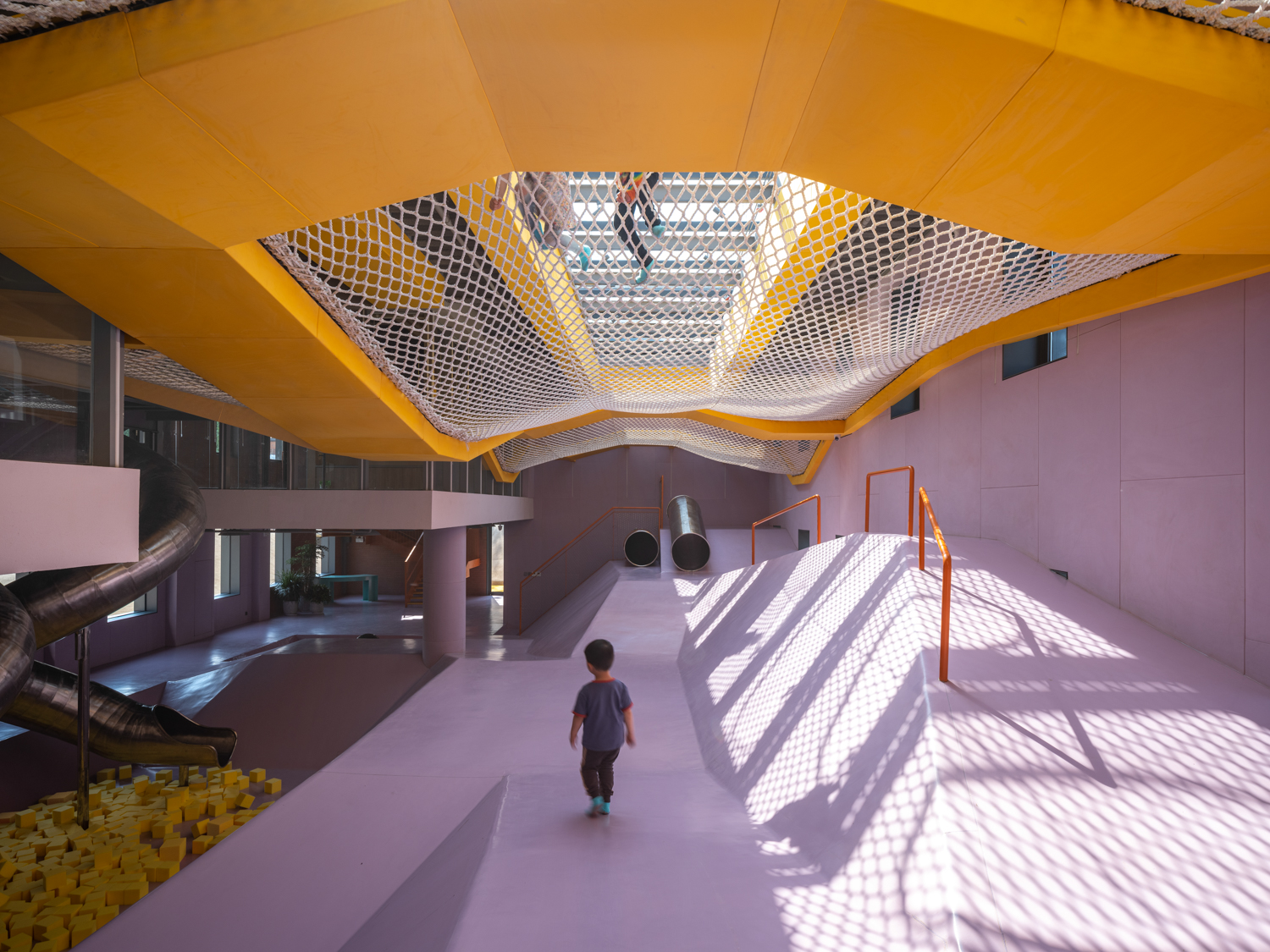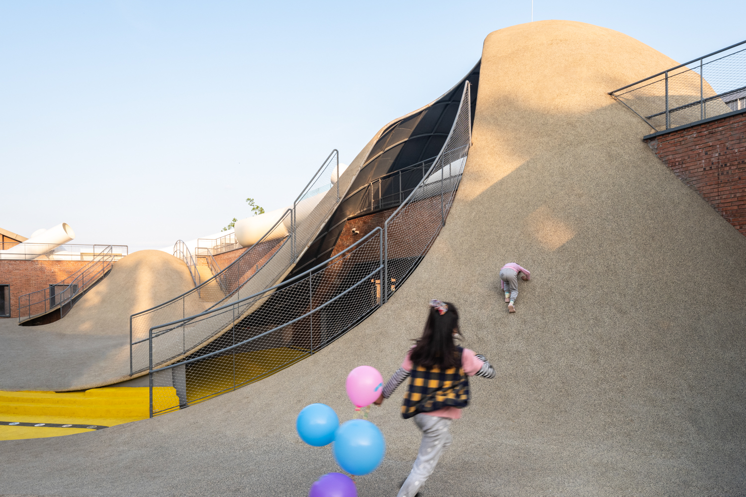 Sàn nhà được bao phủ bằng chất liệu cao su màu nâu đất để trẻ chạy xung quanh một cách an toàn, thiết kế cũng khuyến khích trẻ khám phá bằng cách leo lên và xuống dốc đồng thời tương tác với không gian. Mái dốc có chức năng giống như một nửa mặt tiền, với các khe hở dẫn trẻ em vào bên trong tòa nhà, cho phép chúng chạy ra vào tự do.