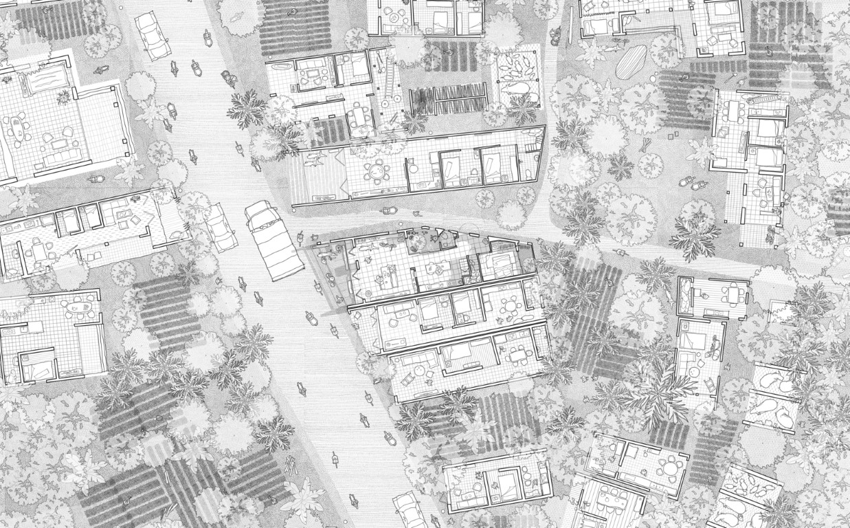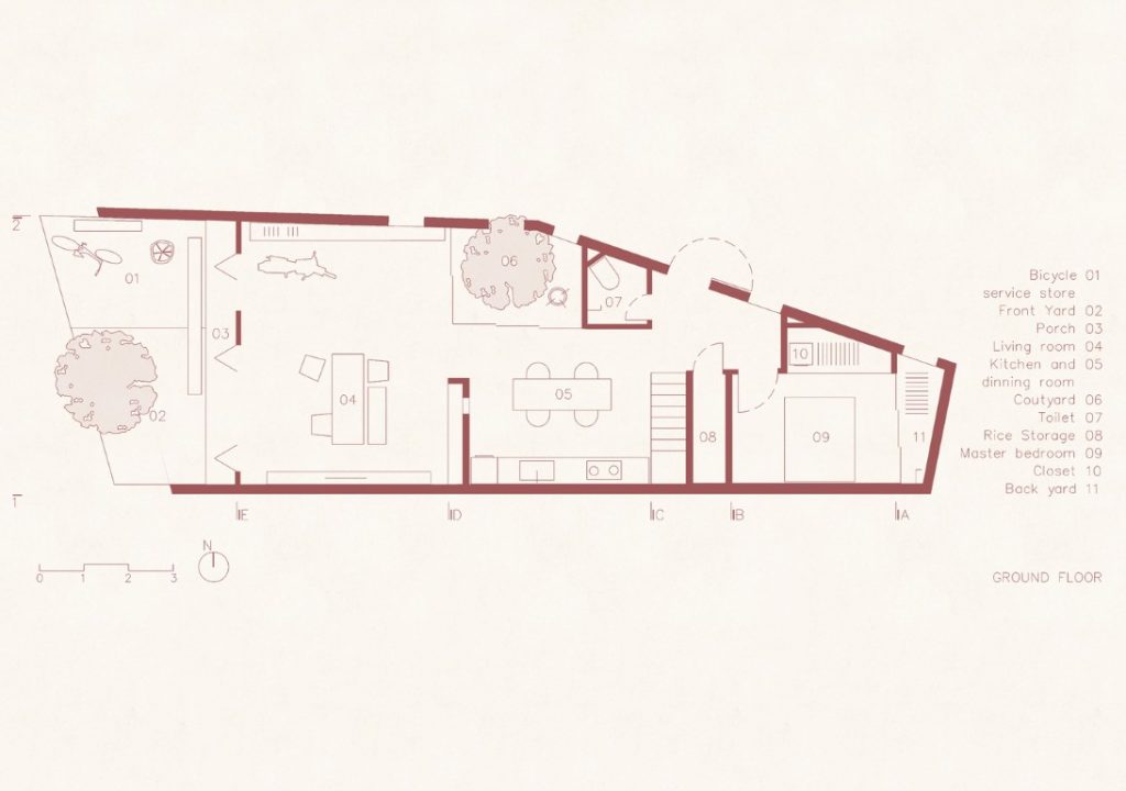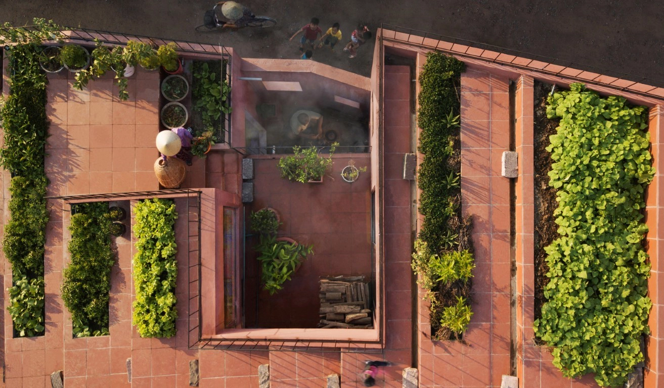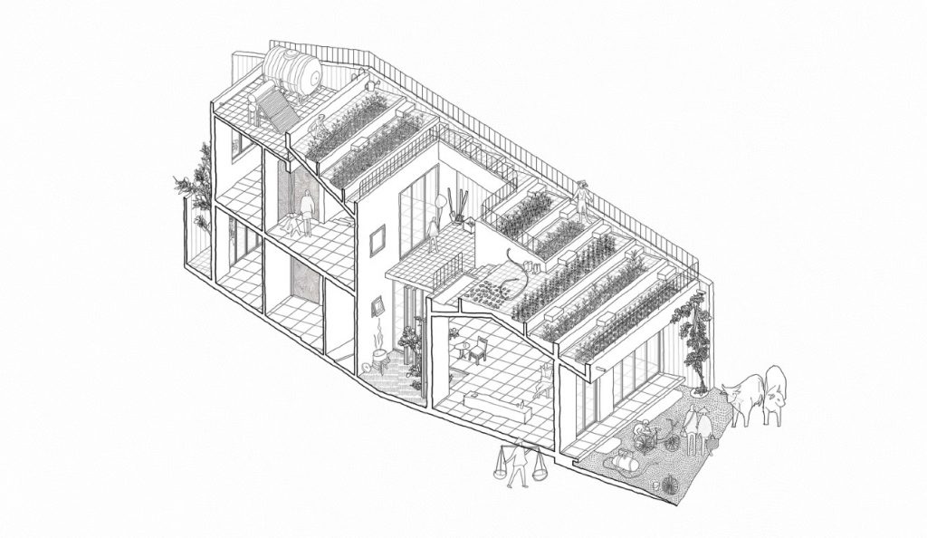 Gắn kết với thiên nhiên, những sinh hoạt hàng ngày của người dân nơi đây là làm vườn, phơi thóc… Vì vậy vườn rau, sân chơi đa năng trở thành linh hồn của những ngôi nhà ở thôn này. Trong một mặt bằng nhỏ, tầng trệt cần nhiều công năng phức tạp bao gồm chỗ sửa xe đạp, phòng khách, nhà bếp, bếp củi ngoài trời truyền thống, phòng ngủ, nhà vệ sinh, sân phơi thóc, kho lúa, sân nuôi gà, v.v…
