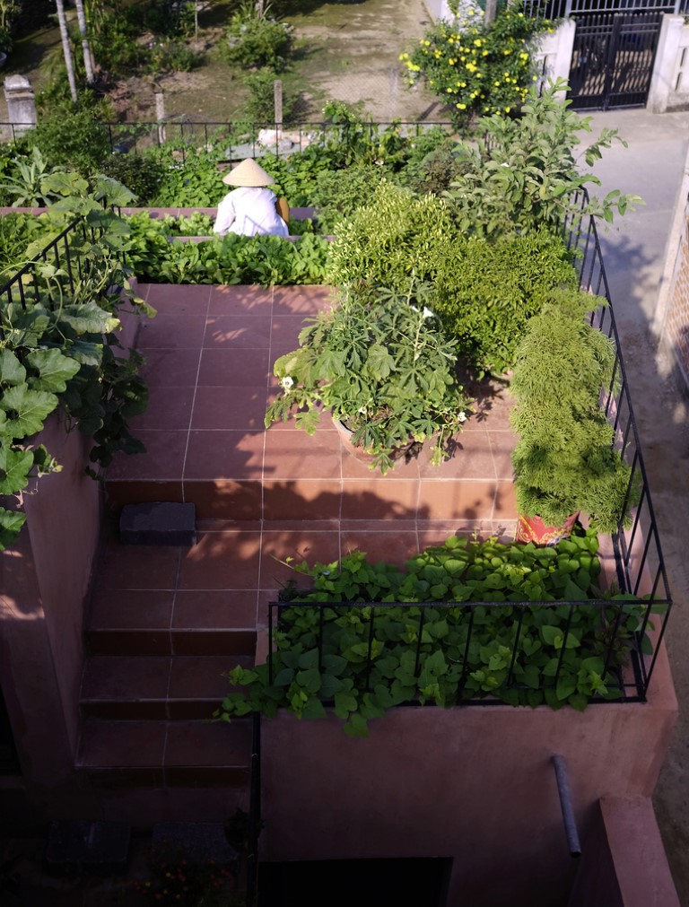 Sân vườn trên sân thượng tiếp giáp với sân của tầng lửng tạo sân chơi và vườn rau nối từ mái xuống tầng trệt. Rau củ thu được từ vườn nhà được sử dụng trực tiếp cho bữa ăn hàng ngày và luôn tươi ngon.