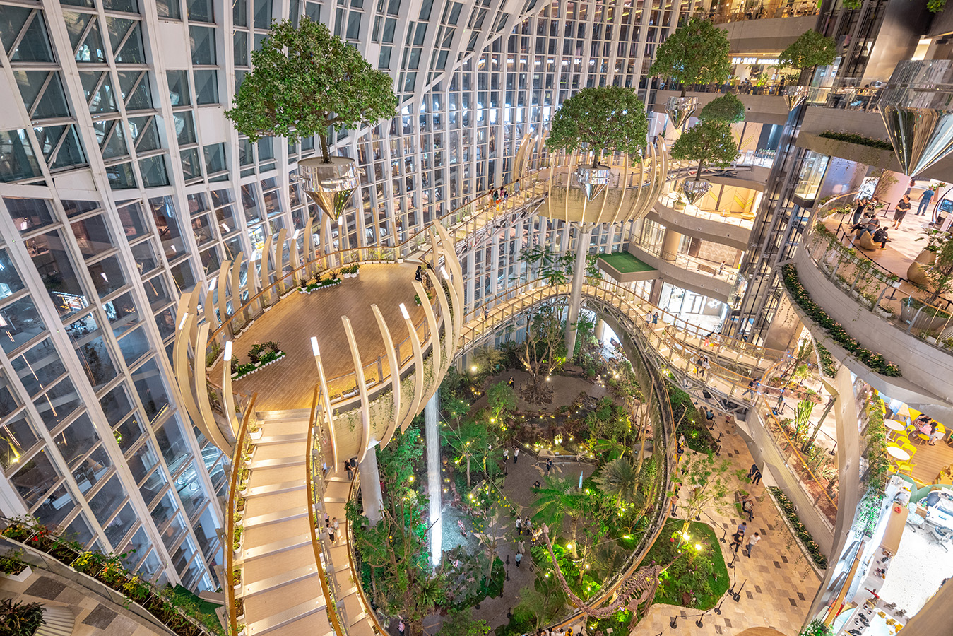 Khu vườn có nhiều tầng và đều kết nối với mỗi tầng trong số bảy tầng của trung tâm mua sắm, tạo nên một không gian mở thoáng đãng. Lối đi trên cao, chỗ ngồi công cộng và đồ đạc treo tạo sự gần gũi với thiên nhiên và giúp mở rộng khu vườn lên phía trên. Thiết kế tạo ra không gian cho việc nghỉ ngơi và tổ chức sự kiện, đồng thời hòa mình vào các hoạt động bán lẻ xung quanh trong một khung cảnh sinh thái.