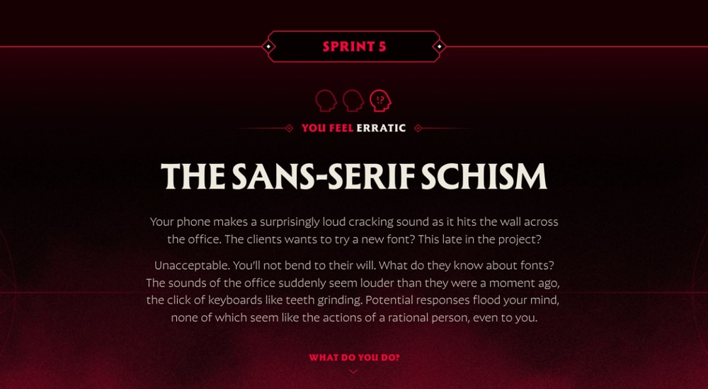 Người chơi nhập vai một project manager, chịu trách nhiệm bàn giao một dự án số nhưng chẳng bao lâu sau, chính dự án ấy bắt đầu có “ý chí” riêng. Deadline liên tục dịch chuyển, yêu cầu chồng chất, và bản brief tự biến mình thành thế lực đối kháng – từng bước bào mòn cảm giác kiểm soát của người chơi. Những gì diễn ra mang cảm giác đáng sợ vì… quá giống đời agency thực tế.