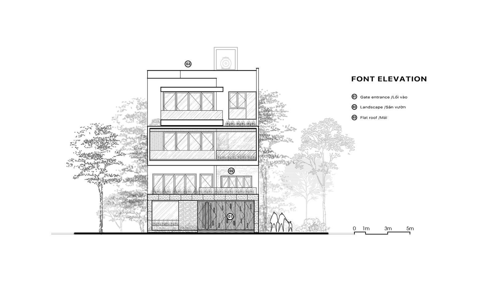 Ngôi nhà có 3 tầng với tổng diện tích sử dụng là 578m2. Các không gian chính đều hướng tầm nhìn ra biển. Ngôi nhà được trang bị cửa sổ kính điều khiển bằng tay để người sử dụng có thể điều tiết ánh sáng và gió tự nhiên vì khí hậu nơi đây nhiều nắng mưa. Toàn bộ sân vườn và không gian sinh hoạt của tầng 1 được nâng lên để mang lại tầm nhìn thoáng đãng từ bên trong, thay vì thiết kế truyền thống – tầng 1 được bao quanh bởi hàng rào cứng – như các tòa nhà khác xung quanh. Đây là giải pháp tốt nhất về thông gió, ánh sáng và tầm nhìn.