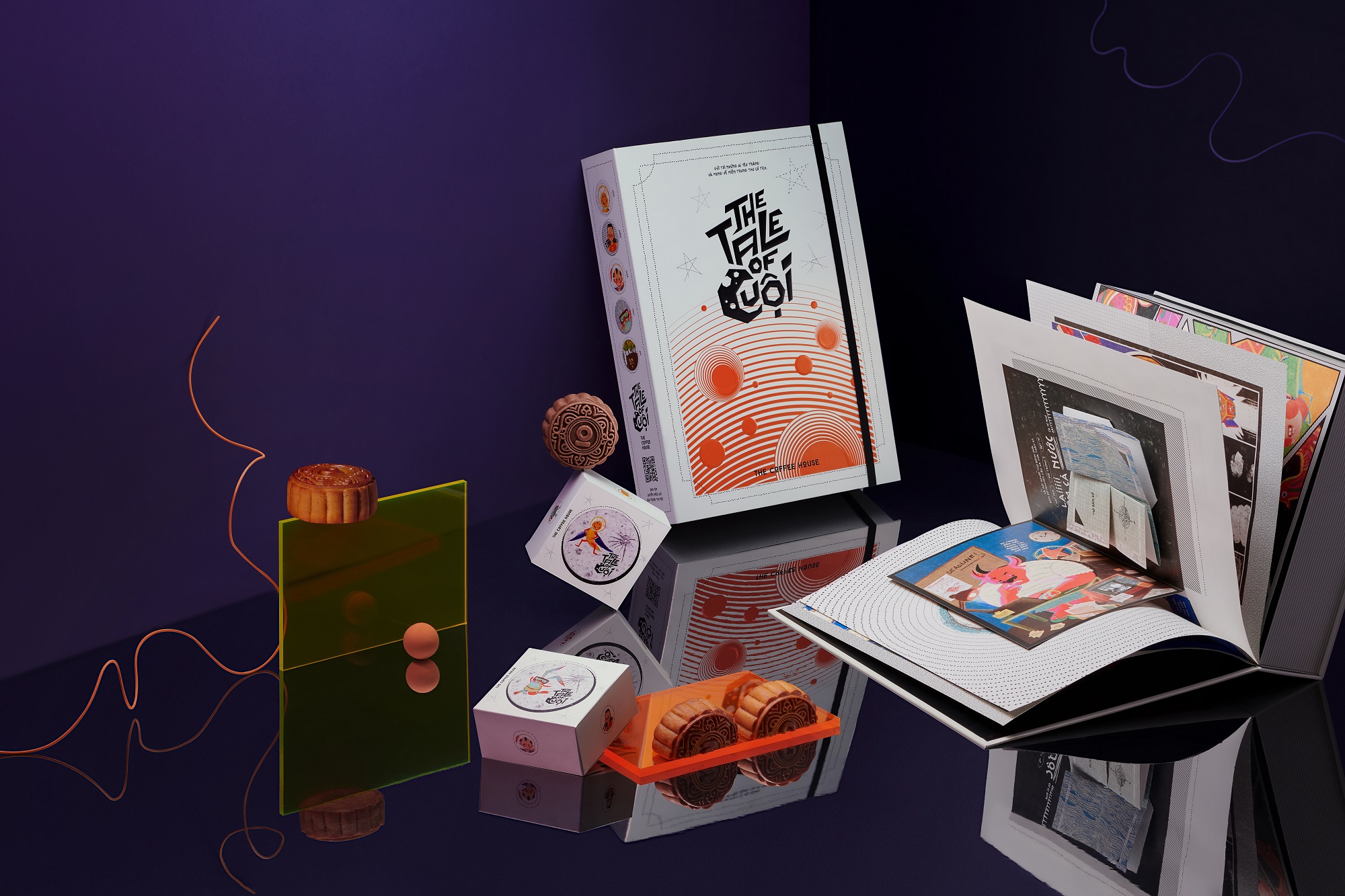 Thoát khỏi hình ảnh đèn lồng năm 2018, The Tale of Cuội 2020 ra mắt công chúng trong hình dáng một quyển sách. Concept này tạo điều kiện để tăng sự tò mò cho người nhận về một câu chuyện đang chờ đón. Ấn tượng đầu tiên ở phần bìa là typography “The Tale of Cuội” lạ mắt, được cách điệu hình ảnh mặt trăng độc đáo. Tiếp đến, thay cho sắc màu đỏ truyền thống, The Coffee House lựa chọn cho mình sắc màu chủ đạo cho phiên bản 2020 là cam, trắng và đen. Sự tối giản và khác biệt trong việc lựa chọn bộ ba màu tương phản mang lại hiệu ứng thị giác nổi bật mà vẫn giữ được nét sang trọng so với các dòng sản phẩm khác có phần tương đồng trên thị trường.