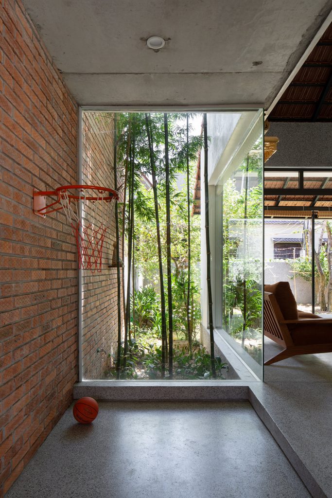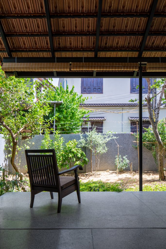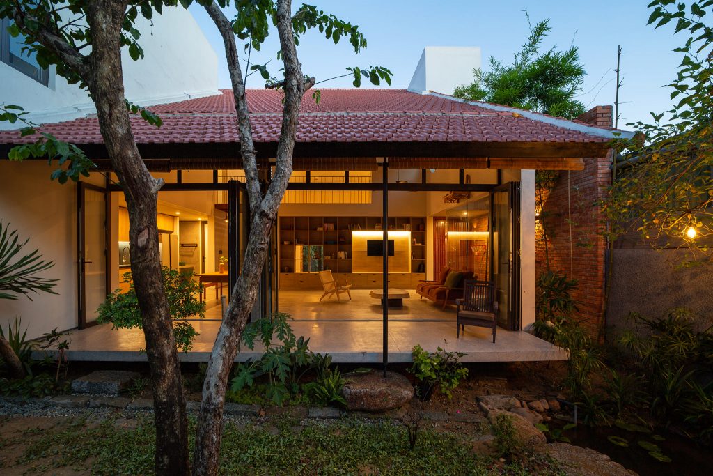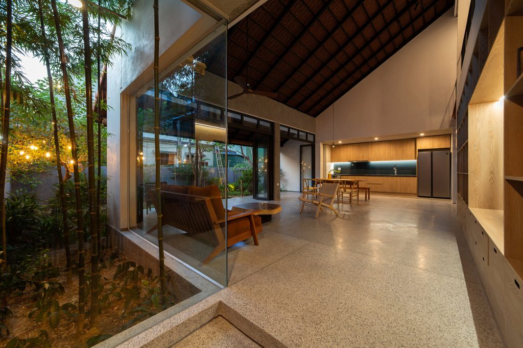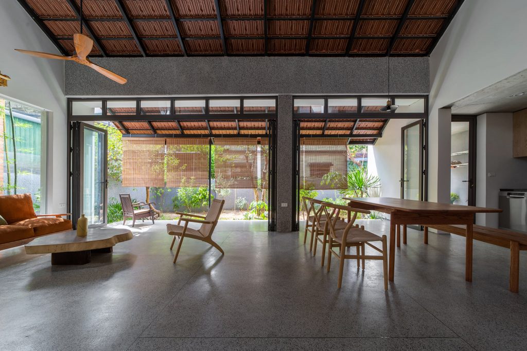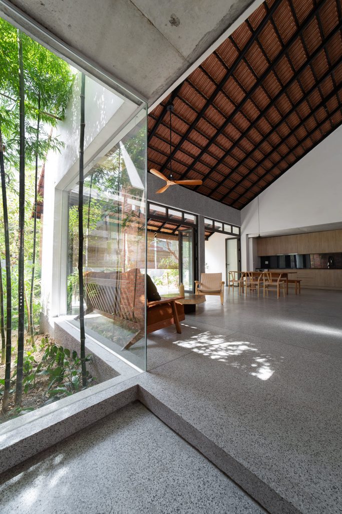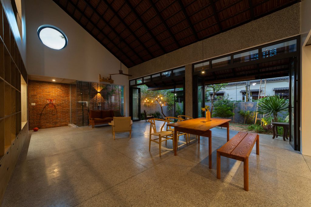 Từ đó một ý tưởng về không gian nhiều lớp, dàn trải dần hình thành tạo ra được chiều sâu về không gian cho ngôi nhà. Toàn bộ không gian sinh hoạt chung được mở ra thiên nhiên thông qua các khoảng hiên dài, nhờ vậy mà ánh sáng tự nhiên gián tiếp đi vào không gian cũng vừa phải và dễ chịu hơn.